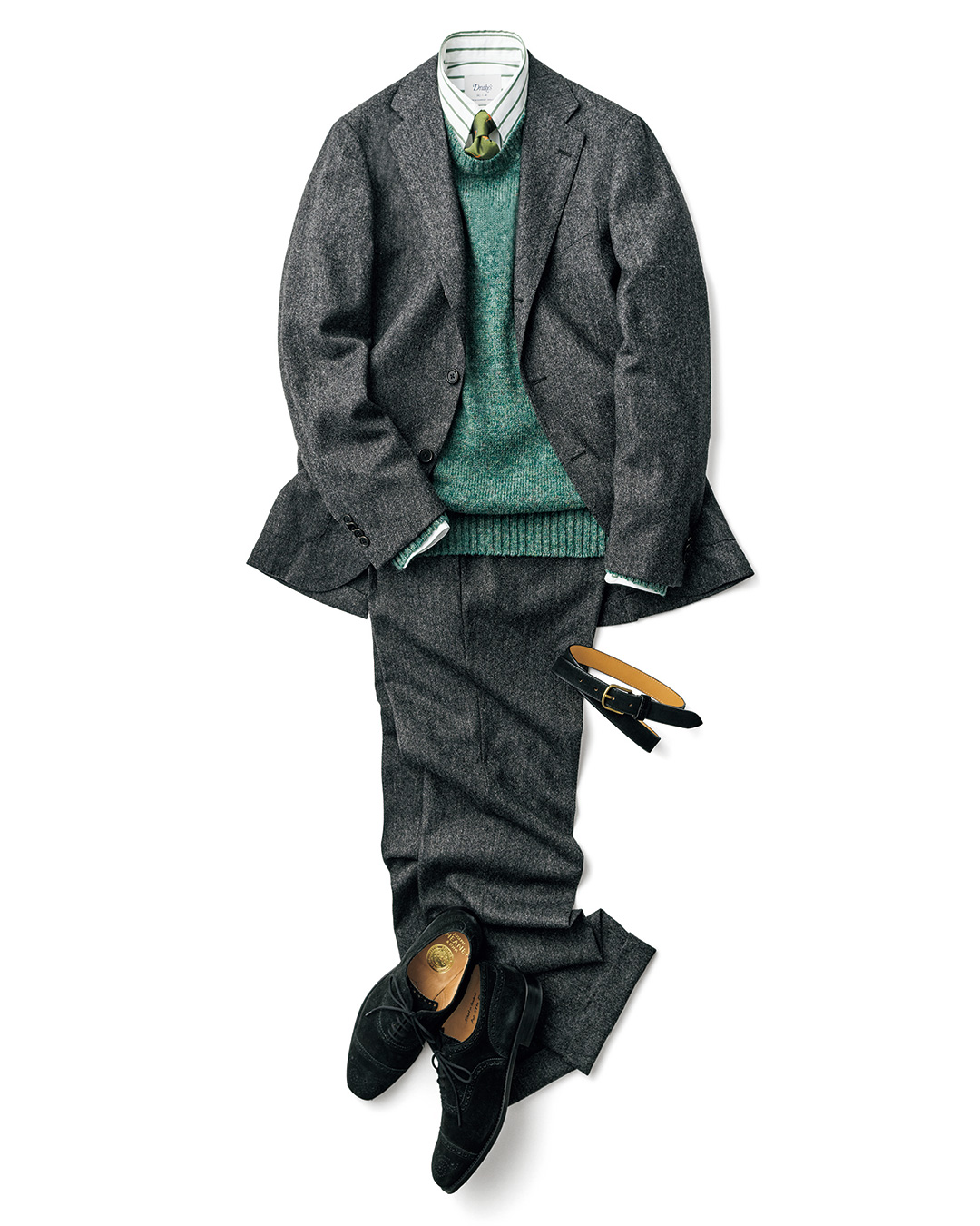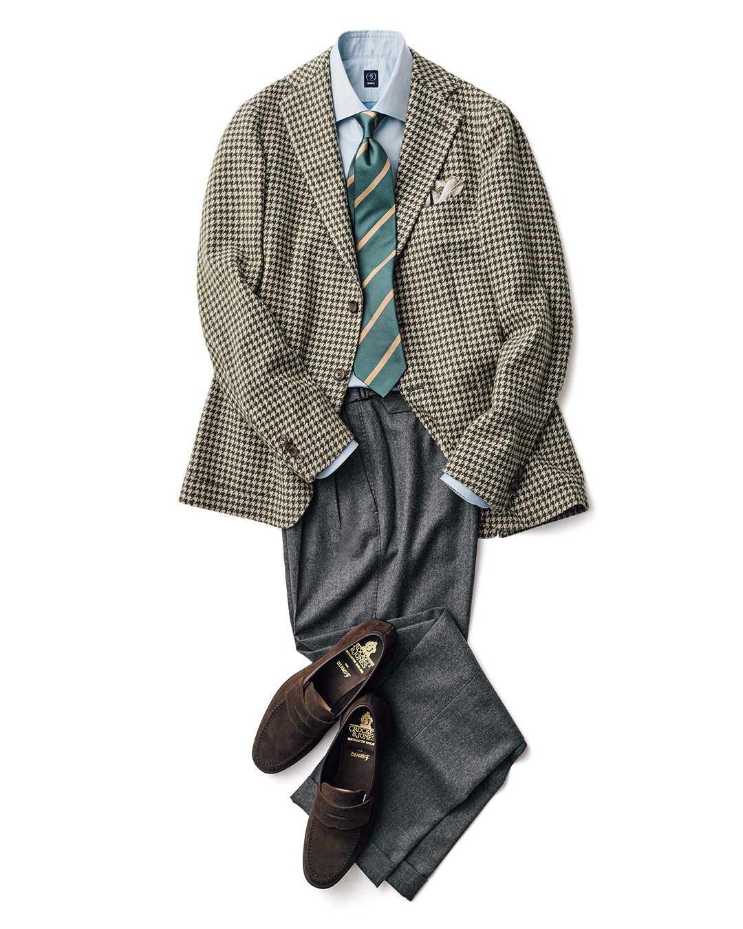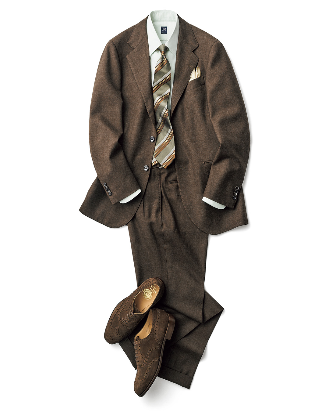对于喜爱棕色风格的朋友,这套造型不容错过。为避免整体配色单调,HOLLIDAY & BROWN 领带是点睛之笔,既能呼应细节配色,其条纹设计还带有流动感。搭配 BEAMS F 浅薄荷绿单品,为整体注入现代气息;而 CHEANEY 皮鞋的加入,则精准呈现了英式复古的优雅风格。