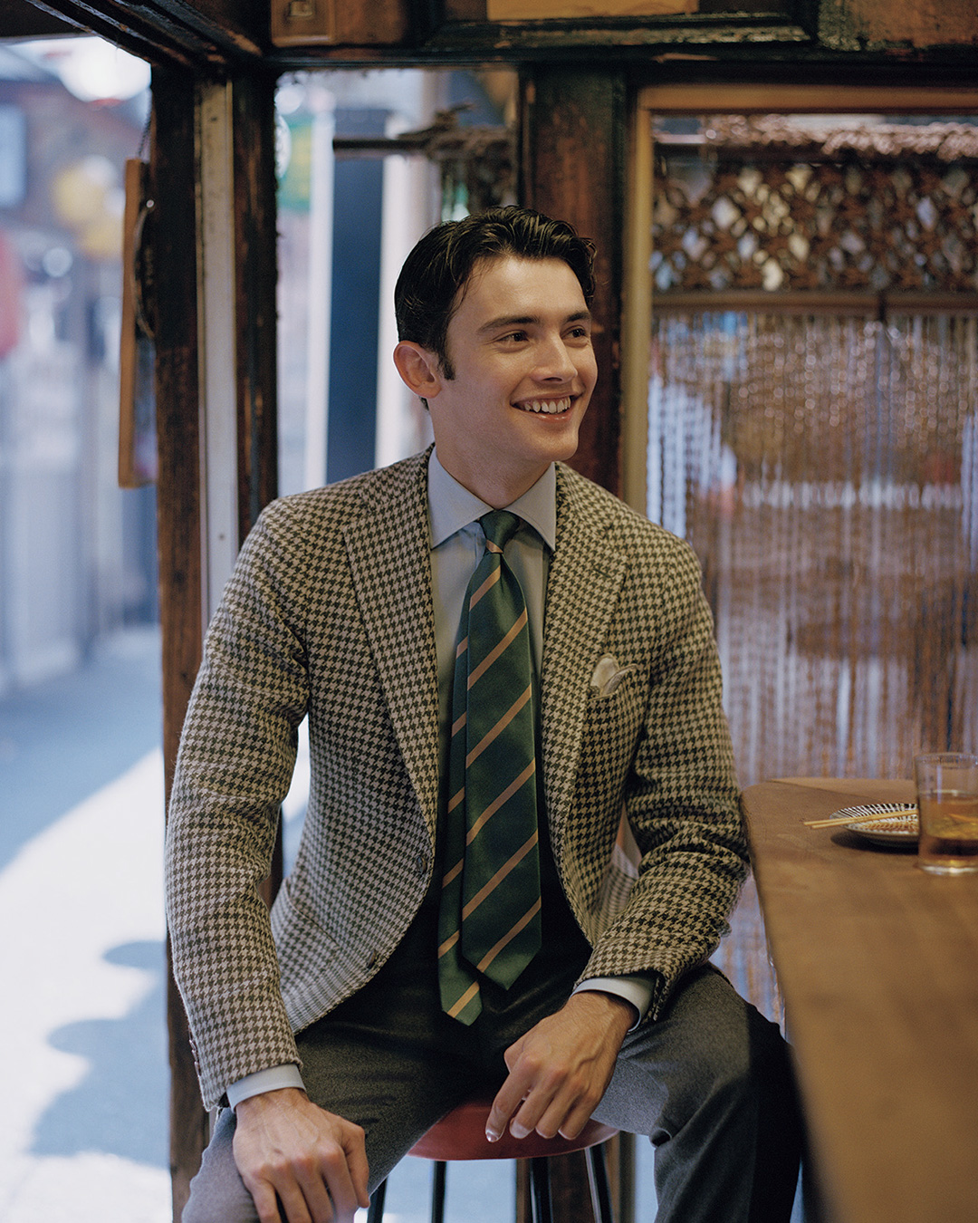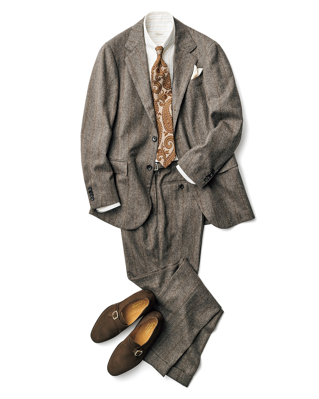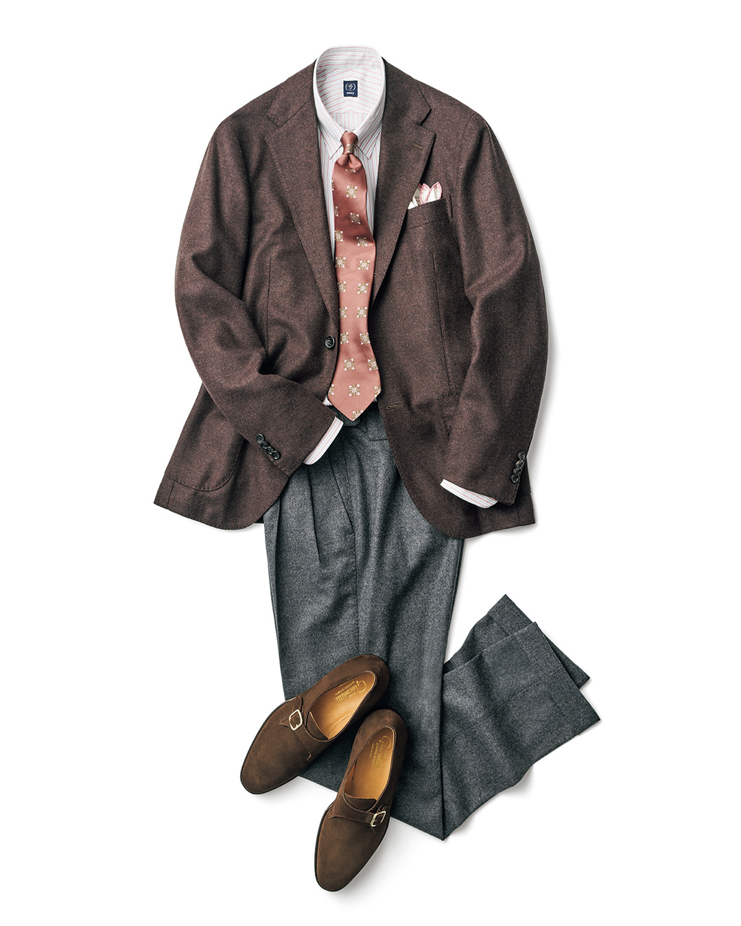 对于喜爱棕色风格的朋友,这套造型不容错过。为避免整体配色单调,HOLLIDAY & BROWN 领带是点睛之笔,既能呼应细节配色,其条纹设计还带有流动感。搭配 BEAMS F 浅薄荷绿单品,为整体注入现代气息;而 CHEANEY 皮鞋的加入,则精准呈现了英式复古的优雅风格。