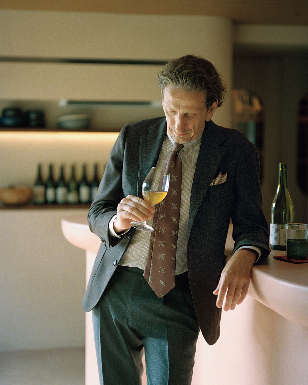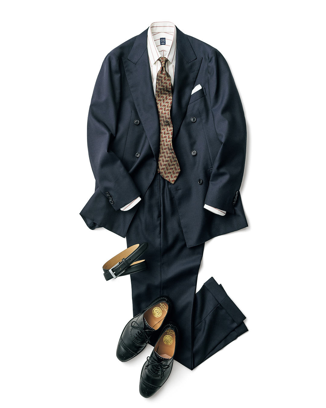 双排扣西装本季再度成为焦点,这套海军蓝款式便采用英国 Alfred Brown 面料打造,经典之余不失现代质感。搭配的 HOLLIDAY & BROWN 棕红花色领带,可轻松提亮造型;融入的 BEAMS F 衬衫,既展现日本制造的精湛工艺,其酒红色条纹也进一步修饰了细节风格。再配上 CROOTS 皮带与 CHEANEY 皮鞋,不仅为整体搭配锦上添花,更巧妙平衡了现代感与传统英伦风。