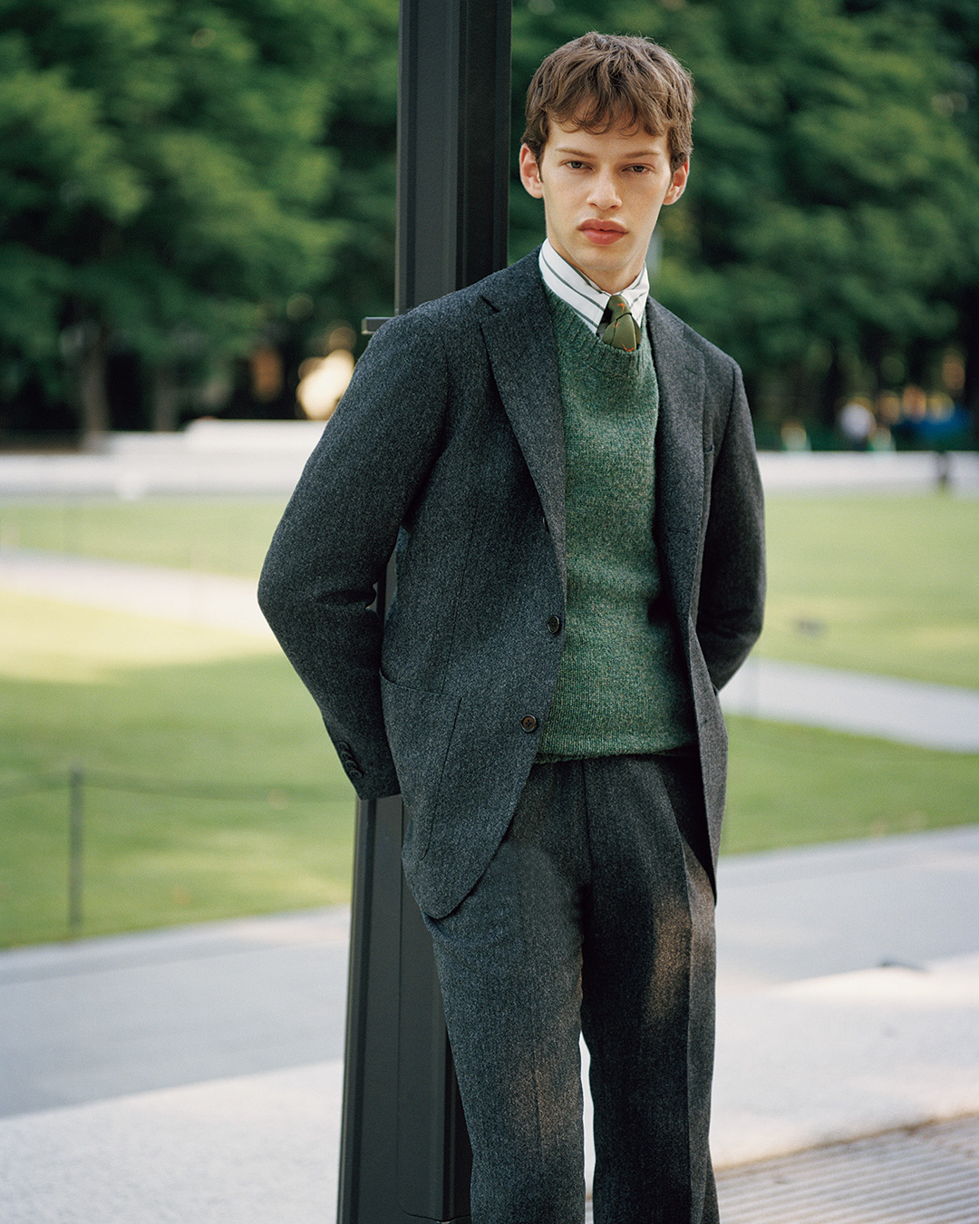 高雅的灰色西装搭配细节处的绿色点缀,无形中彰显穿搭者的造型品位。V领处的留白专为细节造型设计,无论是搭配衬衫、领带还是毛衣都十分优雅,营造出独特的成熟质感。DRAKE'S领带上的野鸡印花,传递出英伦乡村的自由氛围;BEAMS F绿色毛衣采用英国产纱线编织,带来舒适温暖的穿着体验。此外,BEAMS F绿色条纹衬衫不仅在配色上形成呼应,更针对亚洲体型改良了版型细节,让整体风格更干练、更具层次感。