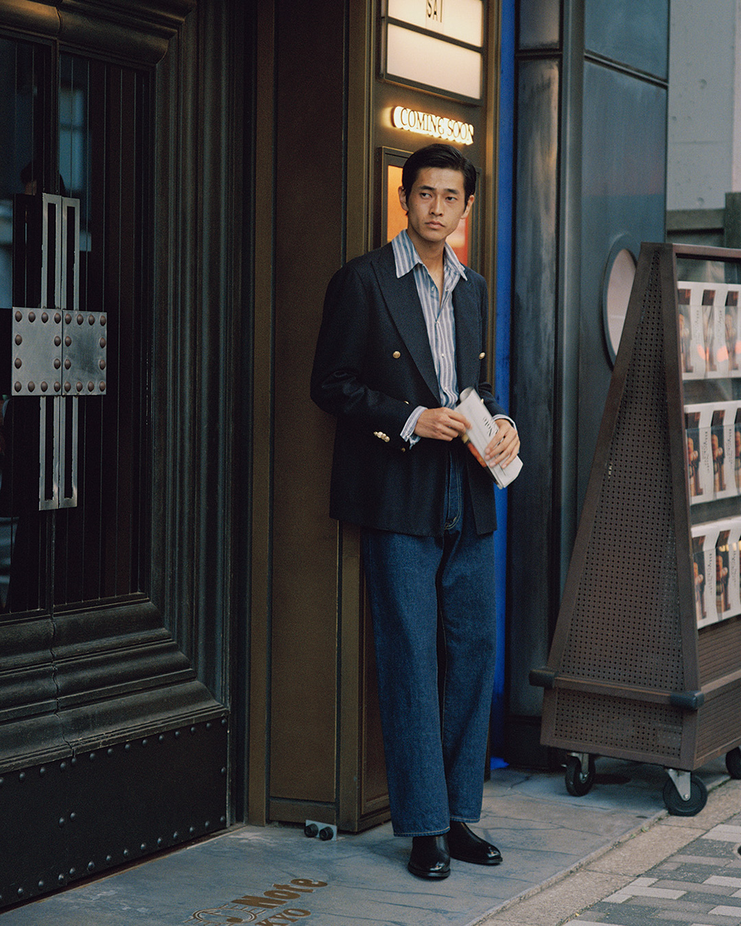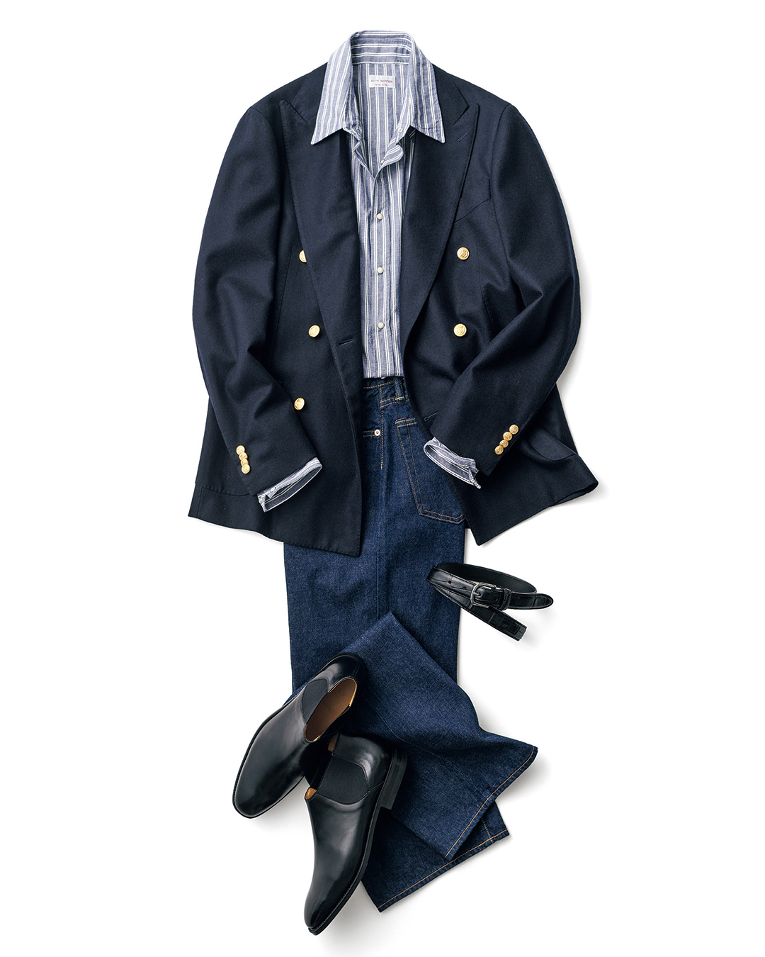 这款海军蓝外套采用双排扣设计,端庄大气,同样由 RING JACKET 联合打造。搭配 CANTATE 牛仔裤,既能呈现独特的法式慵懒风情,其参考70年代的裤型又能营造复古气息。GUY ROVER 这款衬衫为特别定制,长度略长于普通款,但不影响穿着舒适感,是一件百搭的内搭单品。