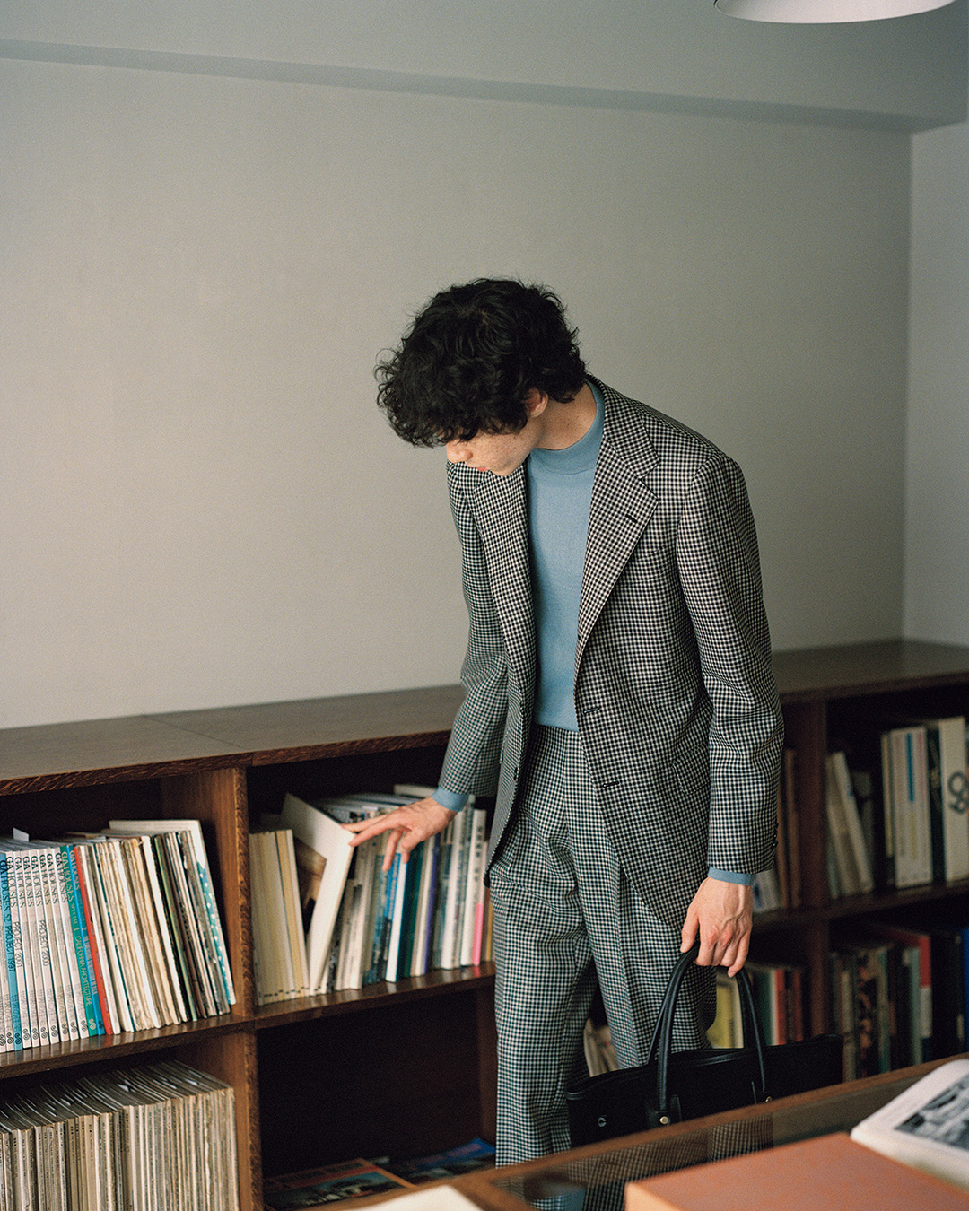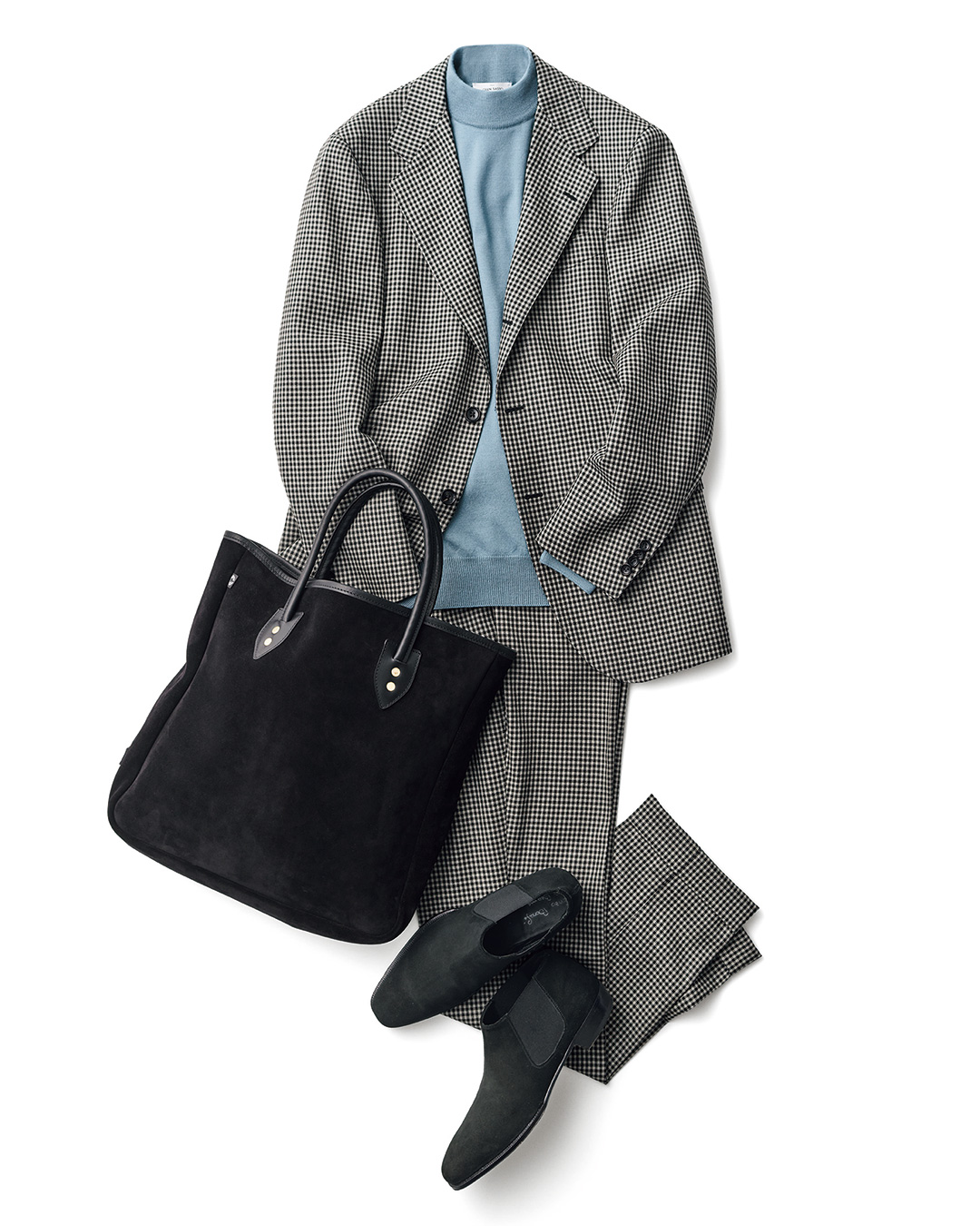 BEAMS F 这款手作西装,采用 Bower Roebuck 面料并融入 RING JACKET 精湛技艺,高贵中不失简约。GRAN SASSO 针织衫质地柔软且风格利落;搭配小牛皮材质的 CROOTS 包袋,尽显独特奢华气息,巧妙融合了高品质材质与隽永风格。