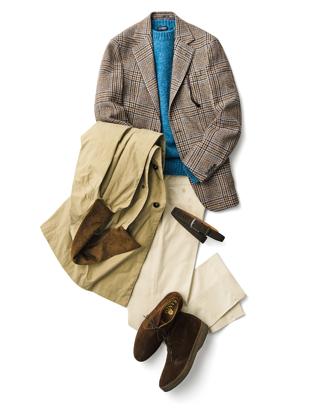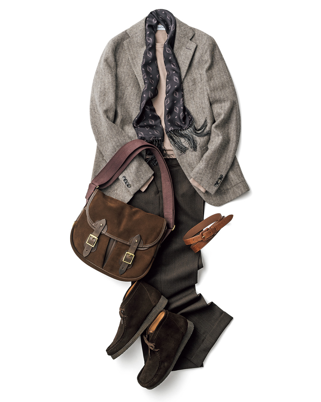 TAGLIATORE 这款夹克为无结构版本,去除内衬后整体风格更显轻松舒适。为营造乡村风格,特意搭配 CROOTS 包袋与 LLOYD FOOTWEAR 靴子,二者在材质与配色上呼应得当。ANDERSON’S 腰带也是造型亮点,采用蜥蜴皮制作,连皮带扣都做了包裹处理,尽显奢华质感与优美的纹理光泽。