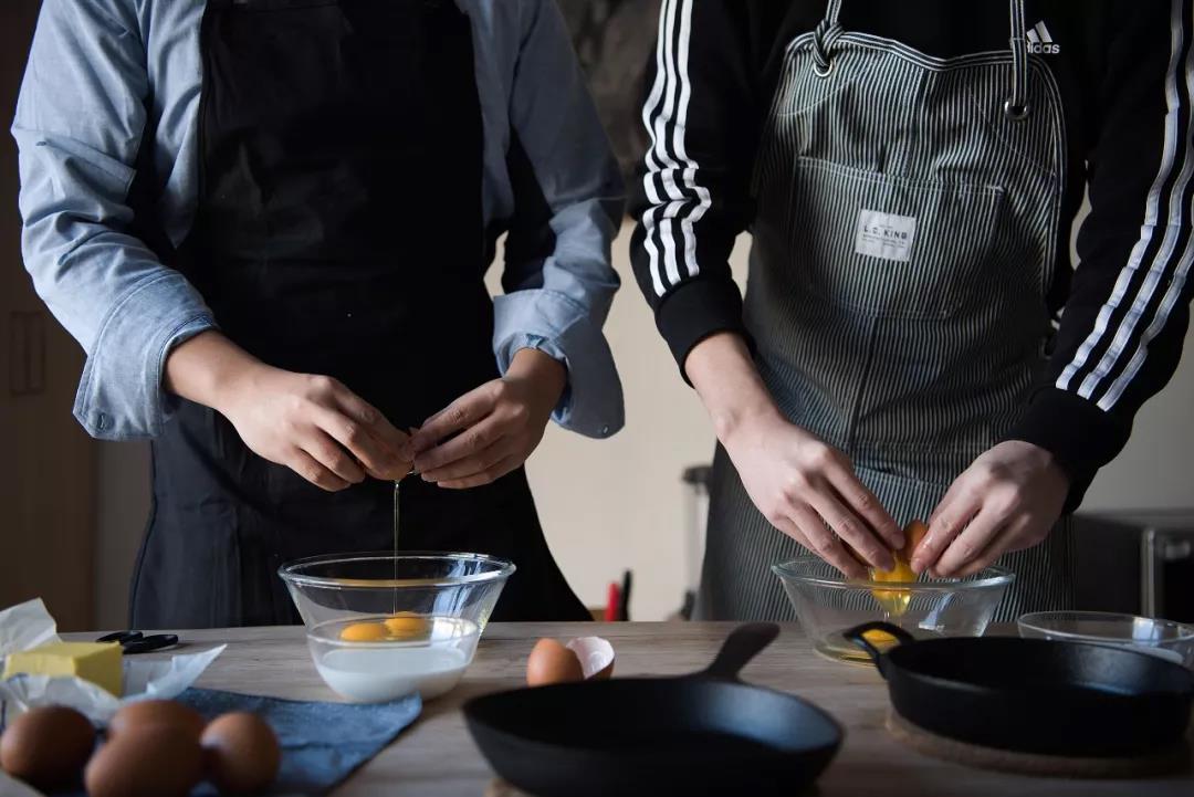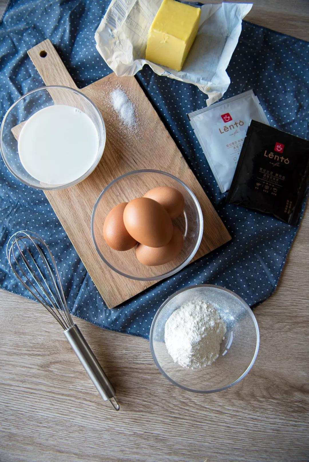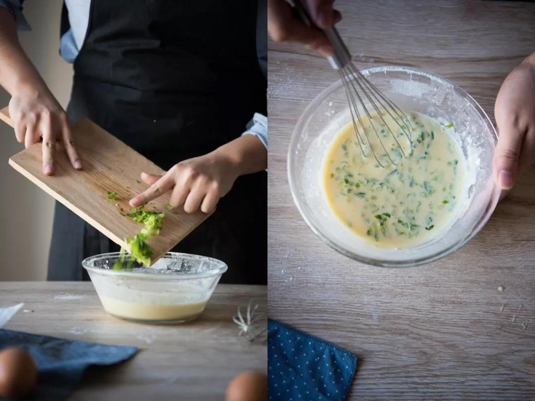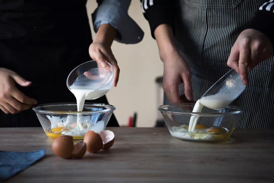 今天我和我的sous chef阿秋一起下厨,做个四手联弹的早餐。我做一个咸版,他做一个甜版。两种口味的基底是一样的,每人打 2 个鸡蛋,再倒入 165g 温牛奶。