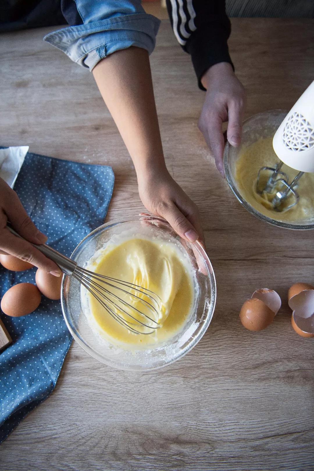 筛入 70g 中筋面粉,搅拌成面糊。因为我们厨房只有一个电动搅拌器,手臂肌肉比较发达的那个人用手动打蛋器。