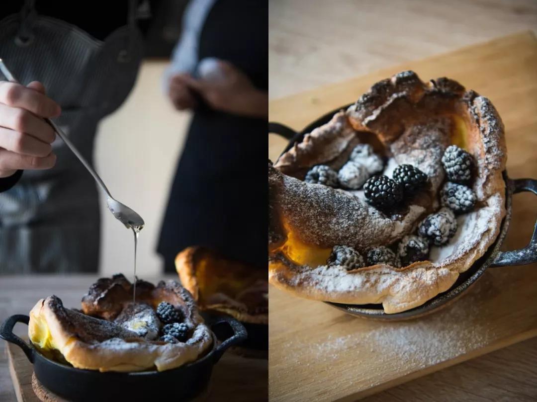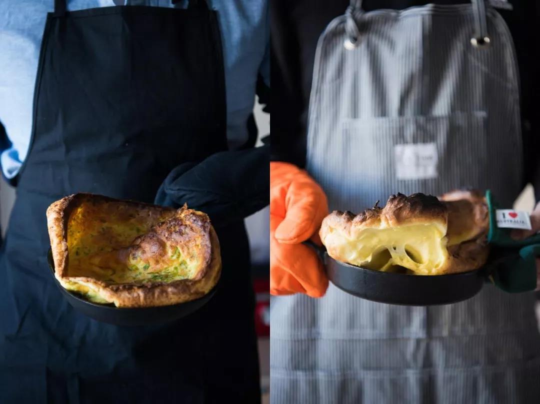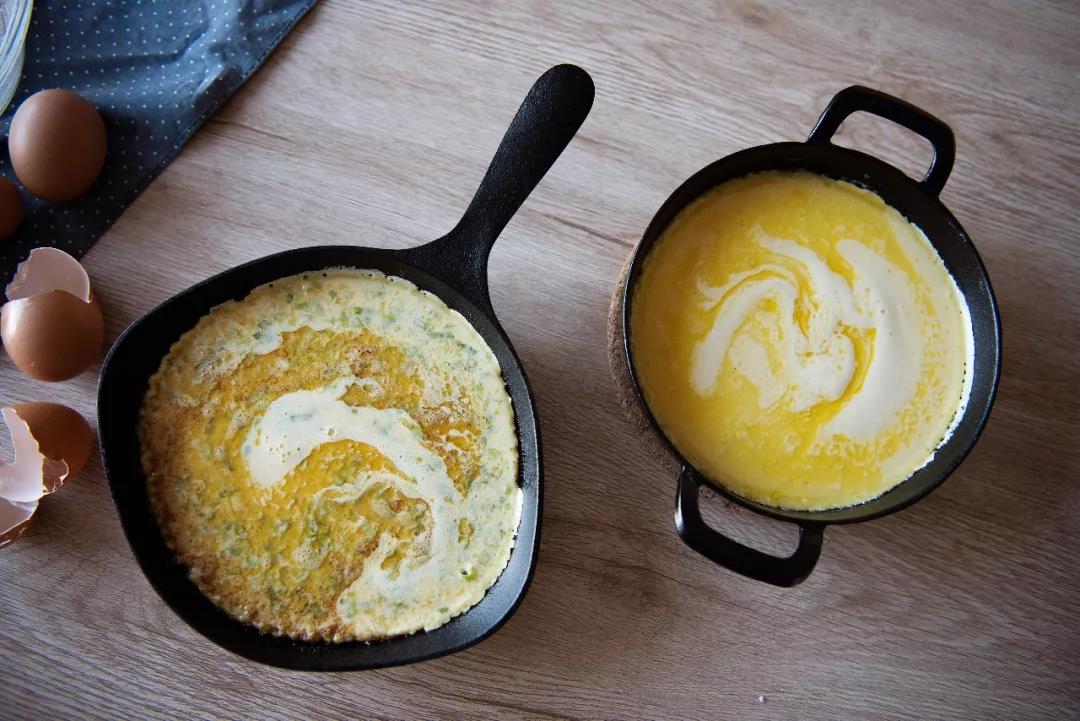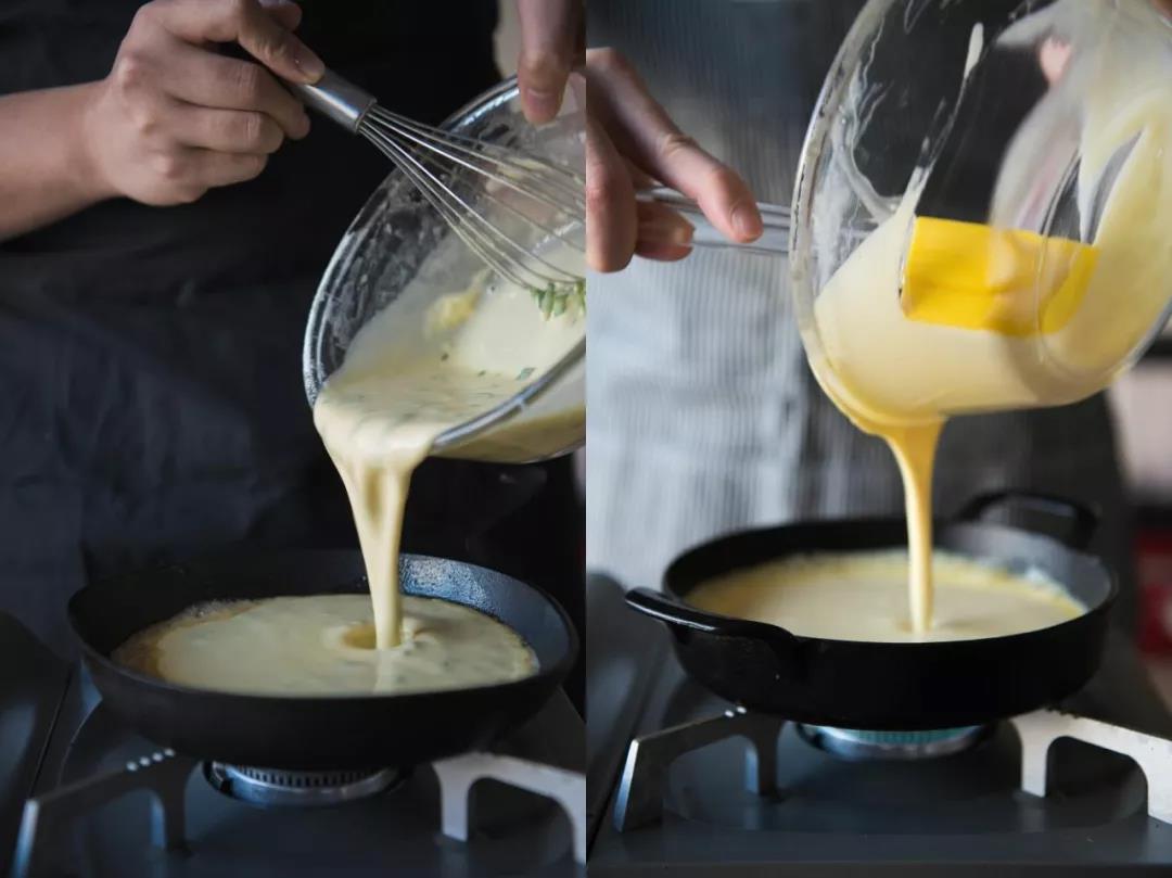 烧热铸铁锅,每个锅里融化 25g 黄油,把咸甜口味的两种面糊倒进去。