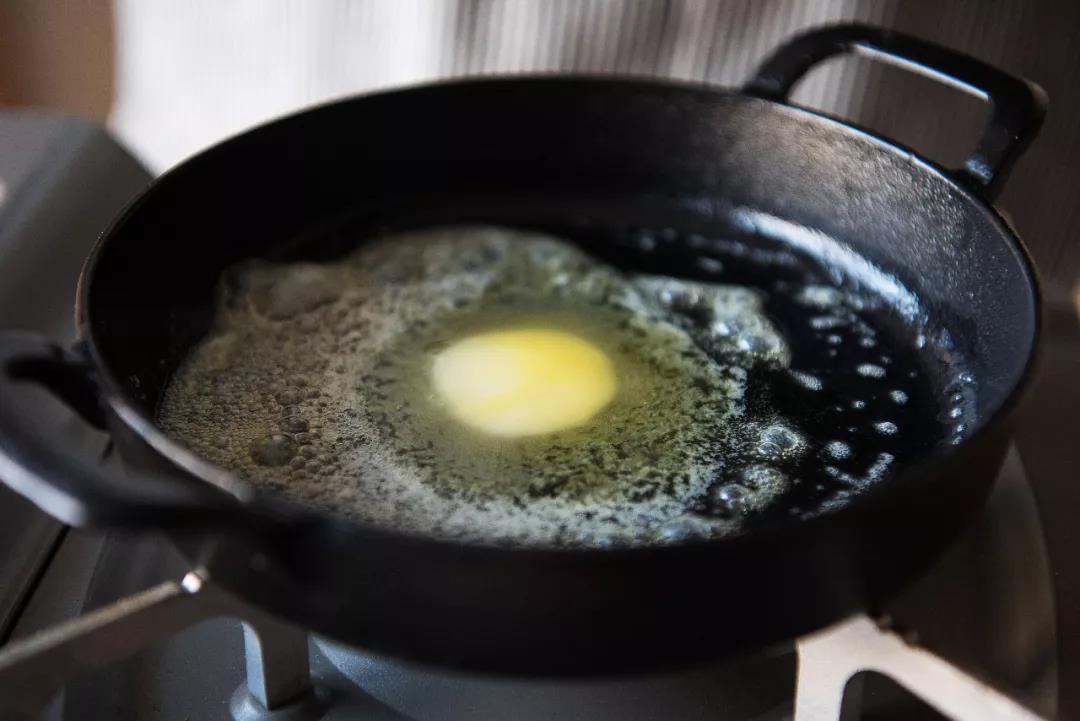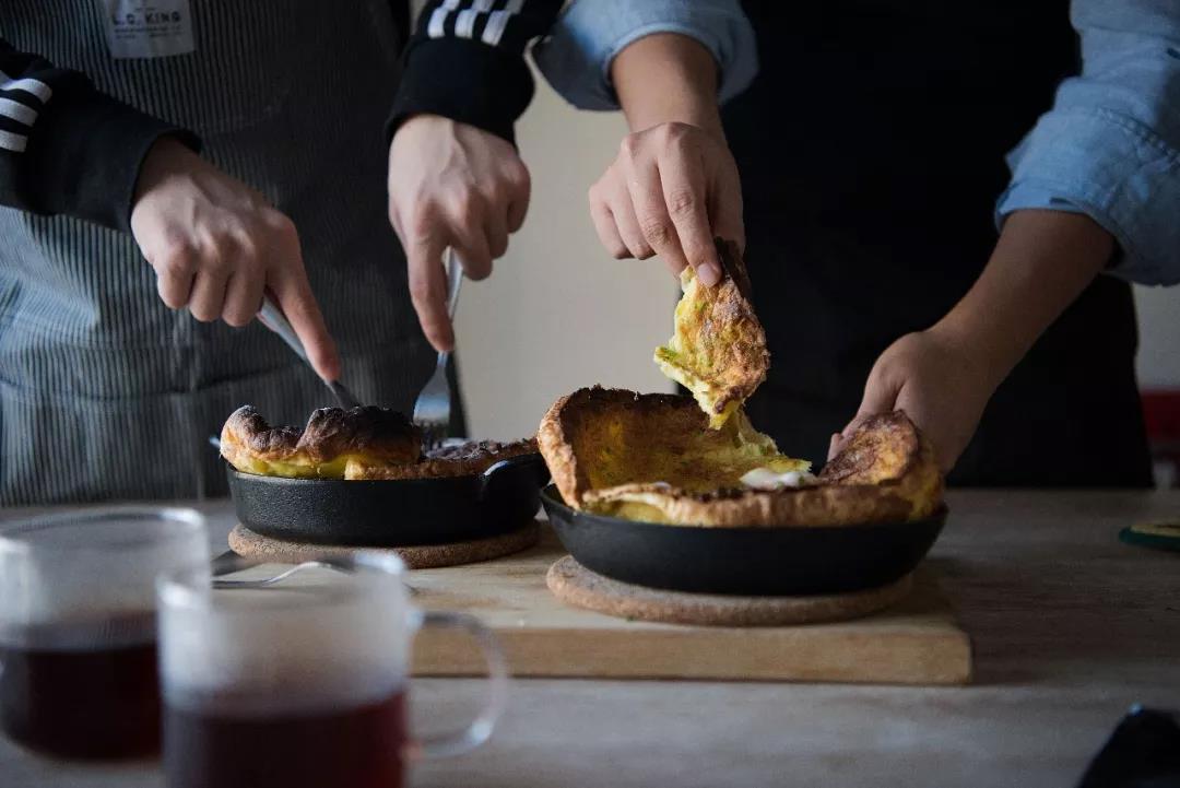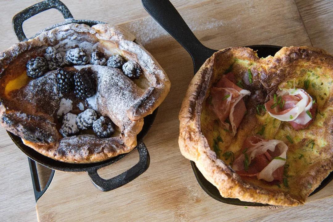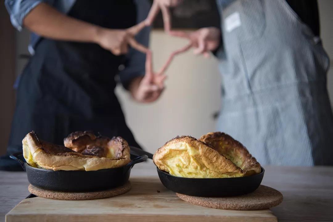 烧热铸铁锅,每个锅里融化 25g 黄油,把咸甜口味的两种面糊倒进去。