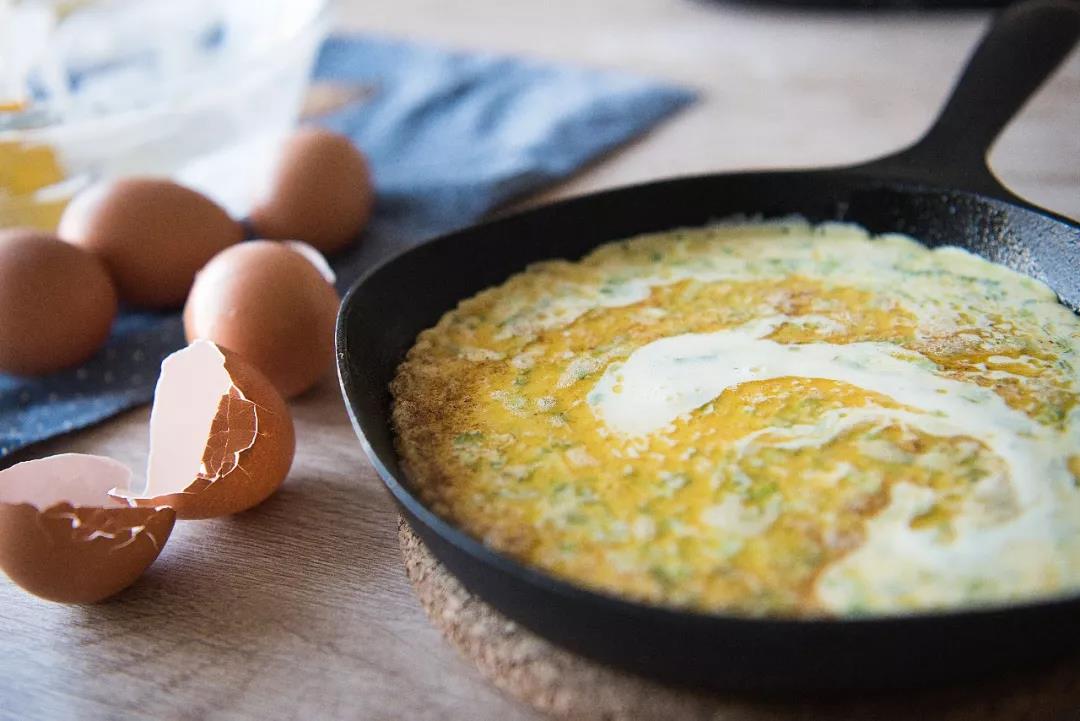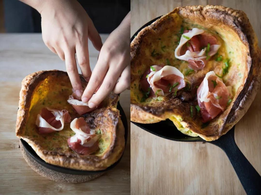 蛋液倒进烧热的熟铁锅中与黄油混合,边缘开始微微凝固,不要搅拌,容易变成炒蛋,直接送进烤箱,记得提前预热,220度烤 15-20 分钟。