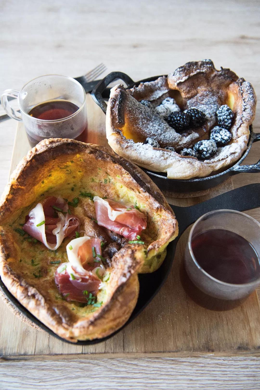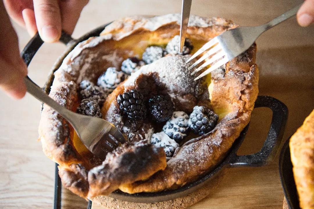 ✨ Dutch Baby 松饼完成!烤好的荷兰松饼完全膨胀起来,就像是舒芙蕾,稍晾一会降温,松饼中间会稍微凹陷,刚好用来装喜欢的配料食材。