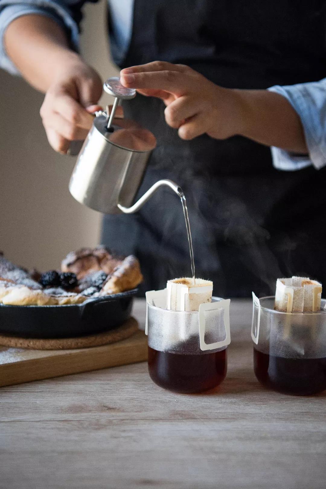 最后做两杯朗朵挂耳手冲:配咸版松饼的 Narino 娜玲珑,富有香草及茉莉花的香气,香气浓厚,口感柔美顺口。配甜版松饼的 Kochere 科契尔,有着柠檬柑橘的微酸口感,与甜品相衬又互补。