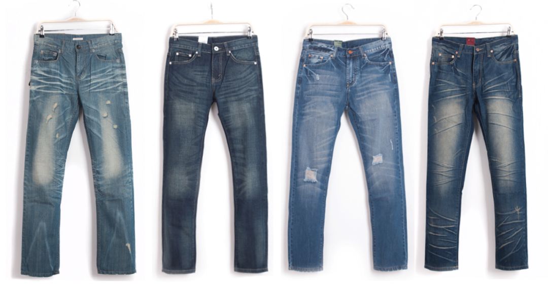 形形色色的刷色牛仔裤。很多不法工厂通过使用大量化学染剂、对工人健康有潜在危害的刷色工艺达到褪色效果。