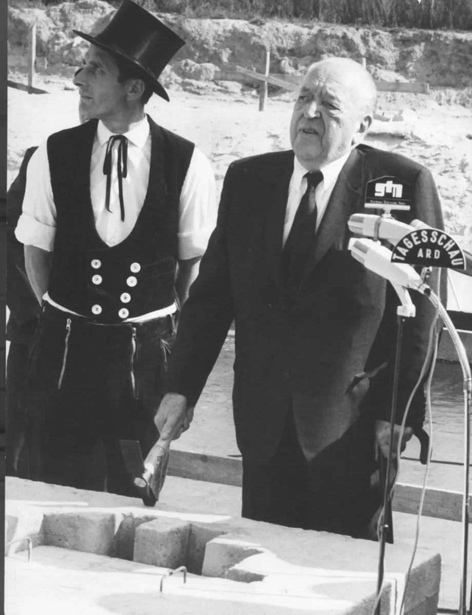 78岁高龄的密斯·凡·德罗出席了柏林新国家美术馆的奠基仪式▽