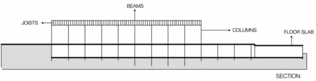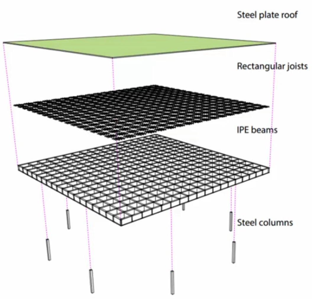 他选择用钢架和玻璃的结构组合体作为美术馆地上部分的立墙,用一整块1.8米厚、64.8米x64.8米的巨大方形黑色喷漆钢板做屋顶,再加上8根十字形柱子,就支撑起了建筑的地面部分。