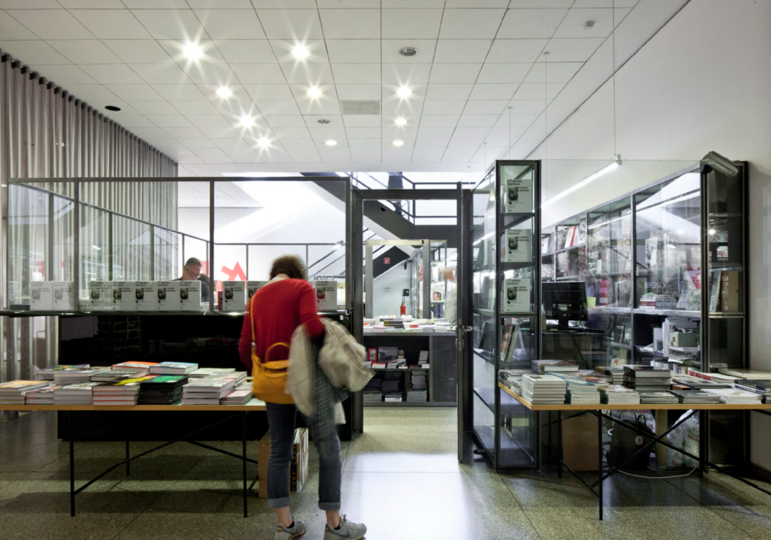 随着商品销售空间需求的增加,1979年在咖啡馆对面的楼梯大厅安装了一道玻璃墙,自此开设了一家临时的书店。这个装置位于独立式楼梯下,在设计上“堵死”了密斯开阔无碍的空间印象。