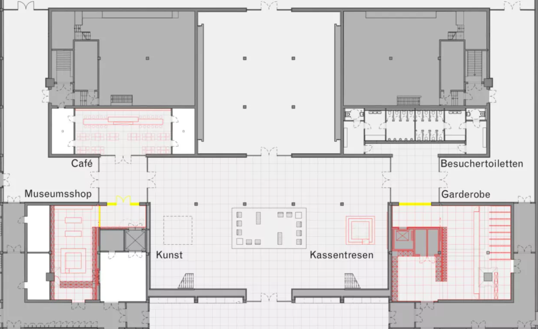 在美术馆最初的规划方案里,密斯·凡德罗曾在“茶点间”的位置规划了一张售货台,最初几年里作为咖啡厅供游客使用,还附带销售纪念书籍的功能。
