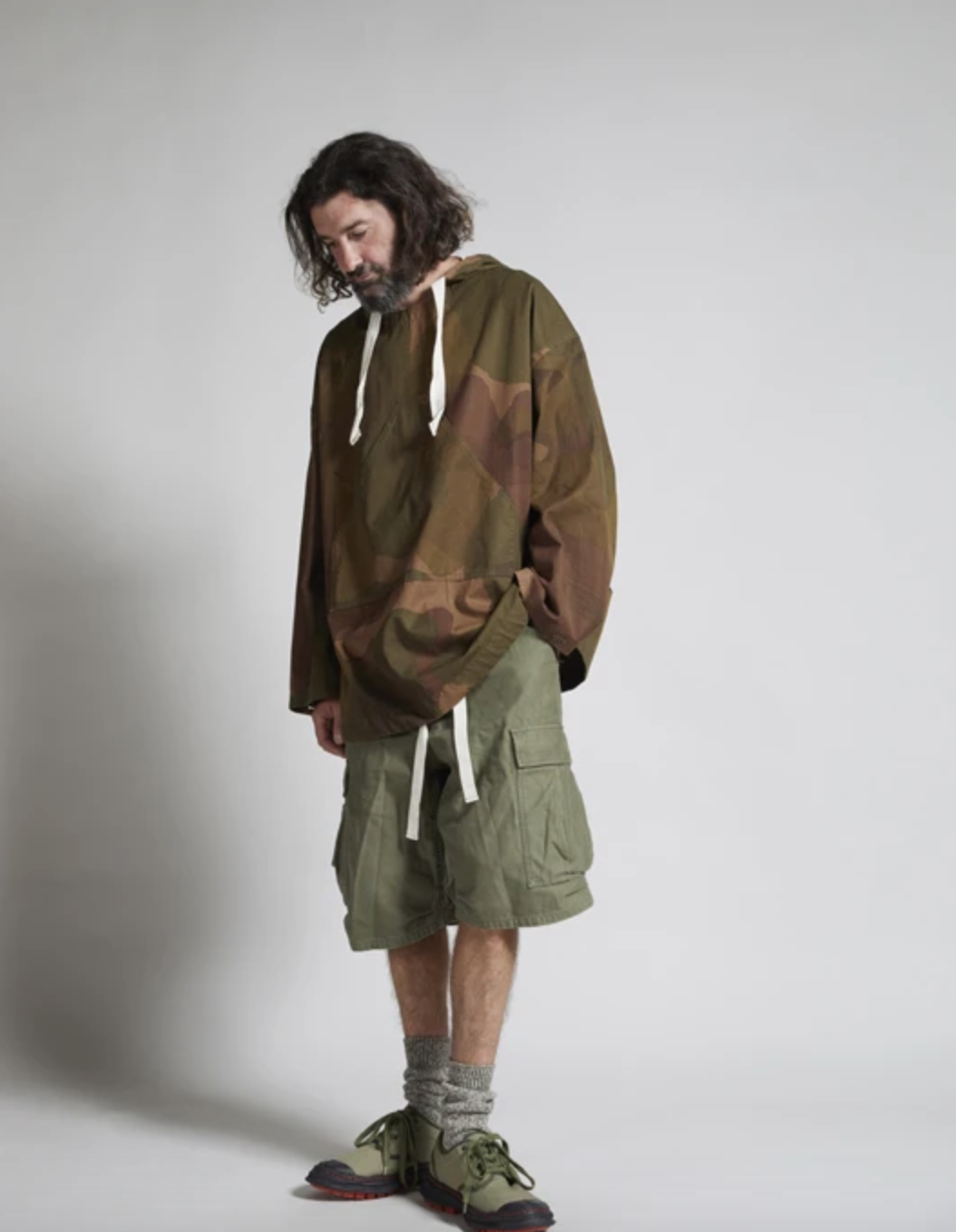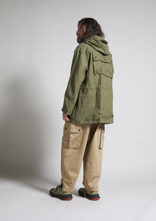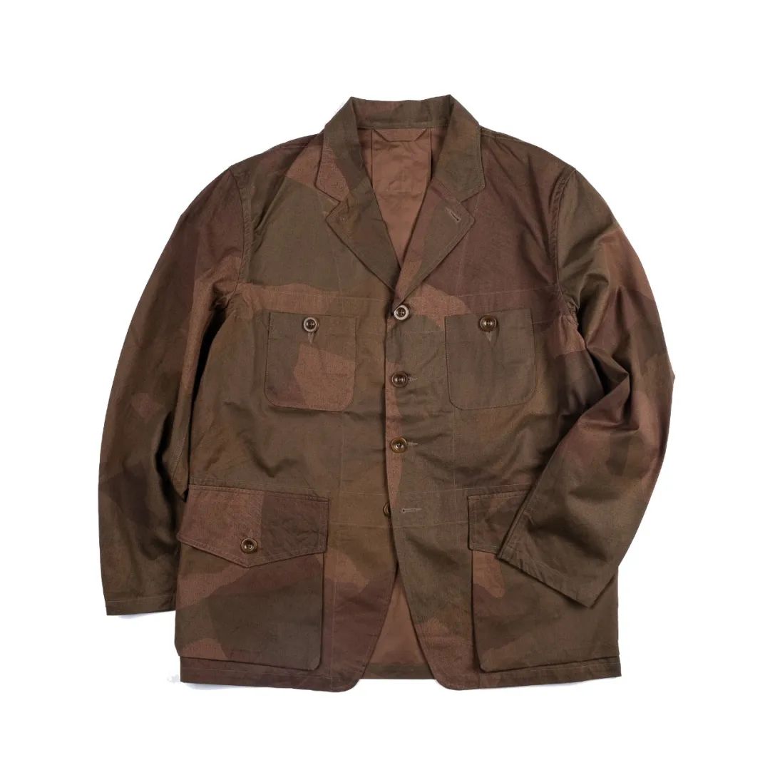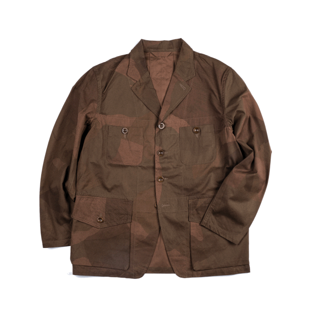 本系列迷彩面料是将40年代流行复古元素,配以现代印刷艺术,使用复杂的染色工艺制作而成。普通的迷彩服使用简单染色工艺制作就可以达到,但这款面料是在白色的布料上进行印刷,重叠了很多的图样。分别结合使用了染料、颜料、二次染色,根据不同的着色方法,来体现复古感的微妙变化,制作出丰富立体的迷彩图案。