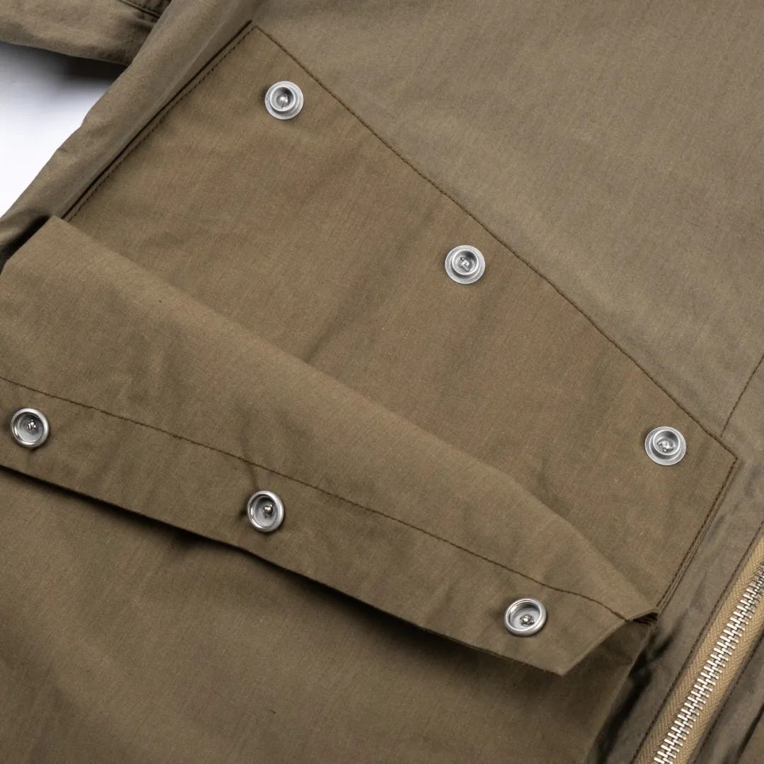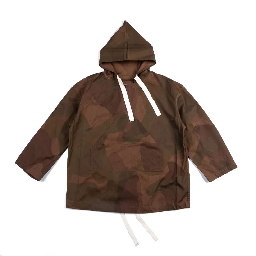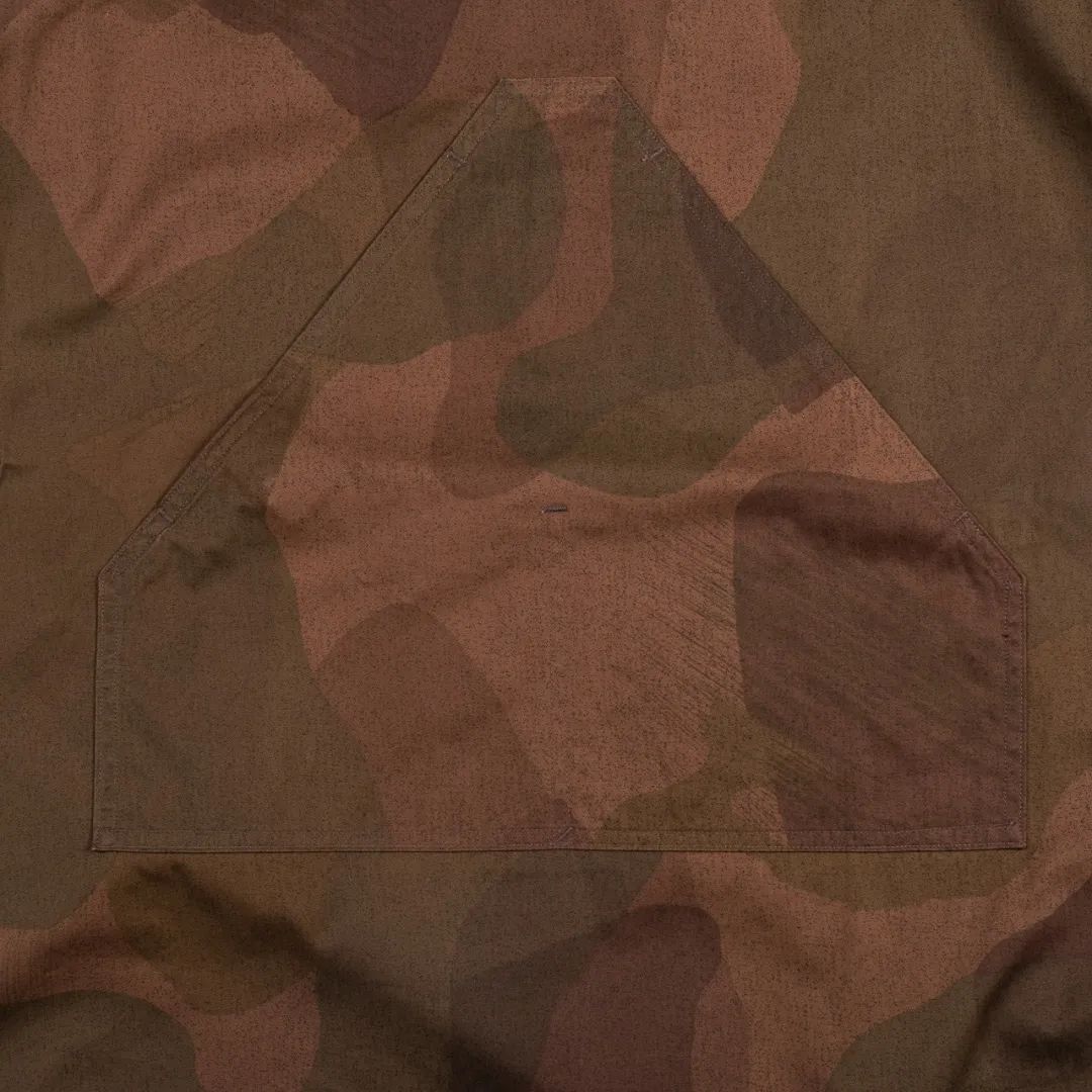 本系列迷彩面料是将40年代流行复古元素,配以现代印刷艺术,使用复杂的染色工艺制作而成。普通的迷彩服使用简单染色工艺制作就可以达到,但这款面料是在白色的布料上进行印刷,重叠了很多的图样。分别结合使用了染料、颜料、二次染色,根据不同的着色方法,来体现复古感的微妙变化,制作出丰富立体的迷彩图案。
