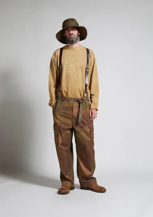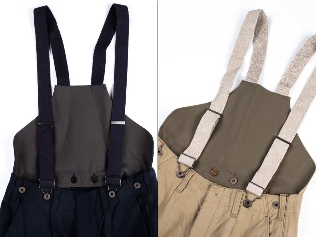 以1960年代德国山岳部队中非常稀有的裤型为基础而进行创造,常年在阿尔比斯山附近的欧洲山岳部队需要经常穿着滑雪服执行任务,为了方便穿着,这款采用可拆卸式吊带设计,大大方便了使用,这也是这条裤子最大的亮点之一。