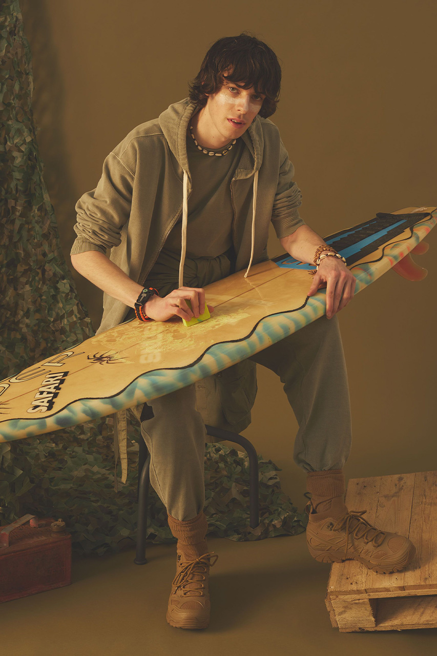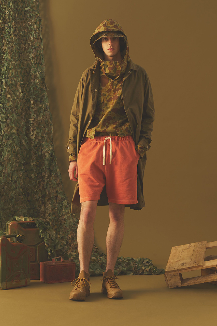 Nigel Cabourn 近来推出 2022 春夏季单品型录,此次 Nigel 结合海滩氛围和军事色彩,旨在回溯 60 年代的一段往事。当年在越南战争期间,因 22 岁海军士兵 Larry Martin 的创见,岘港的美溪海滩成立了一个以冲浪疗法为主的俱乐部 “China Surf Beach Club” ,专供前线士兵休息和娱乐,成为当时年轻士兵们的主要文化与疗愈场所,也在越南战争期间接待了数千名美军。为了捕捉这种独特的时代精神,Nigel 为 2022 春夏季设计了一系列服装,这些围绕经典美式运动装为蓝本展开的单品均采用有机回环针织材质打造,其中 Bush Jacket 、 Dutch Pant 以及 Bush Shorts 等主要军装款式单品则使用轻质棉制成。为了迎合清爽的春夏氛围,迷彩图案被重新设计成丛林/雨林风格的样式,同时作为 Nigel Cabourn 标志性色彩之一的橙色也为春夏季带去鲜明格调。