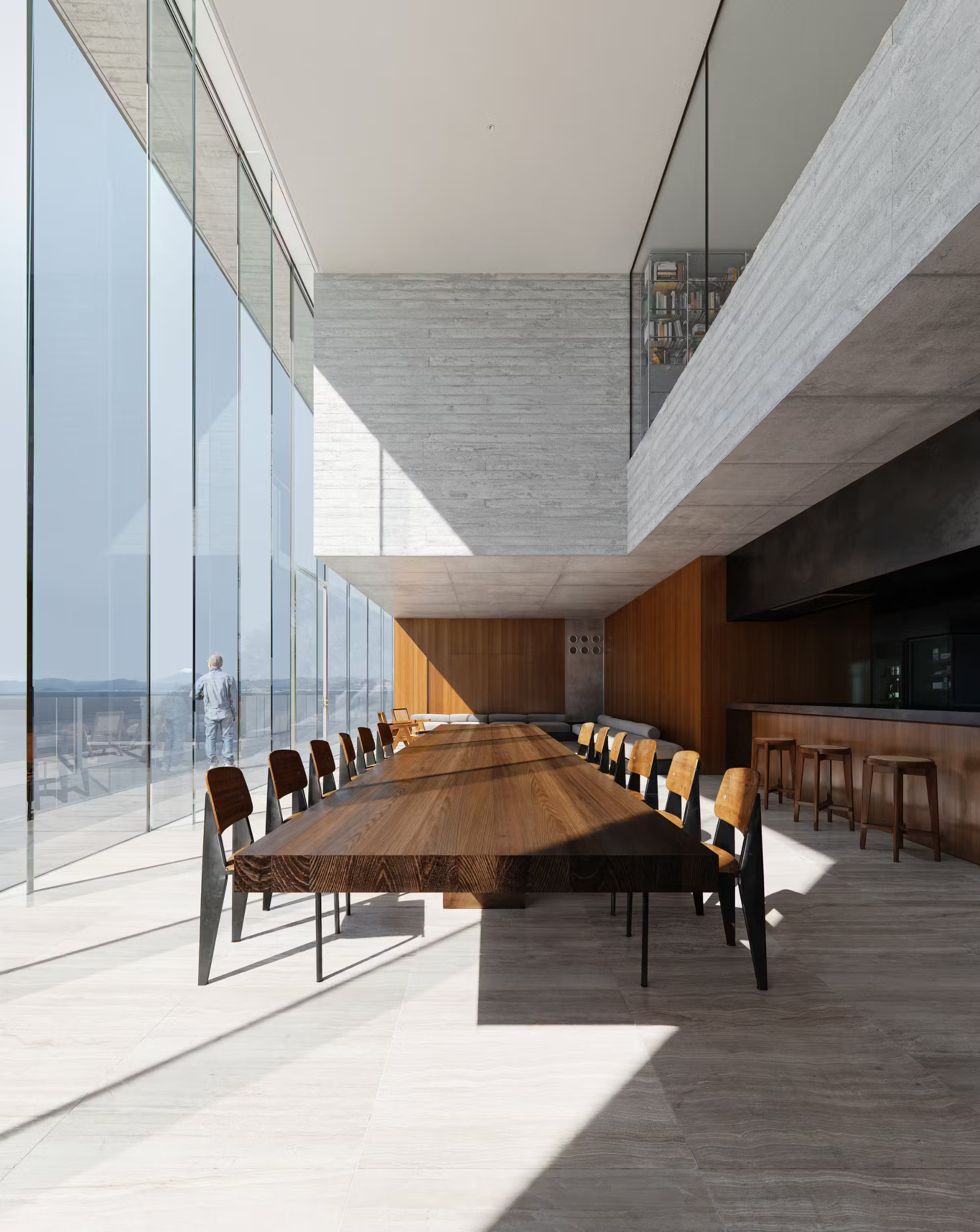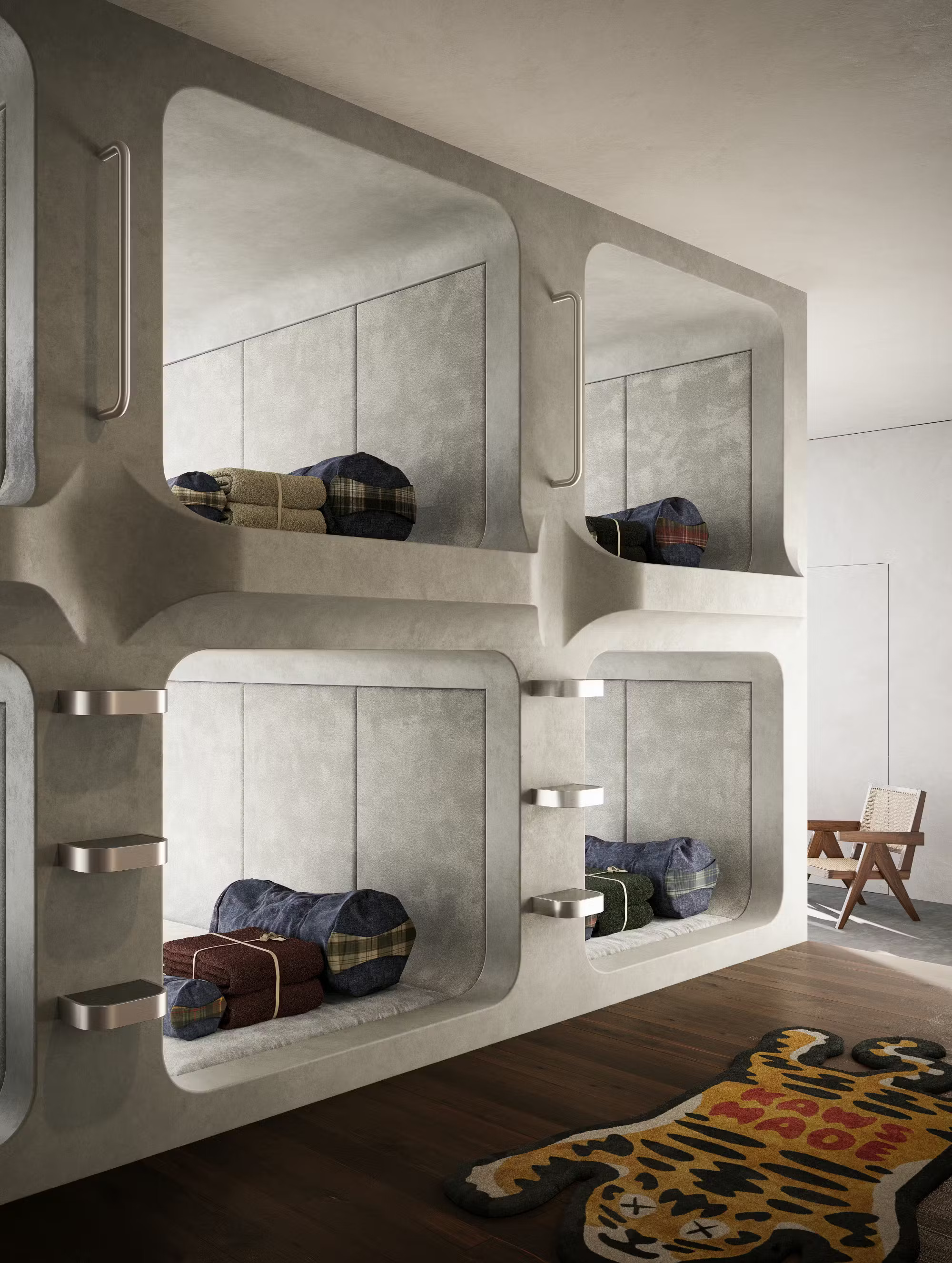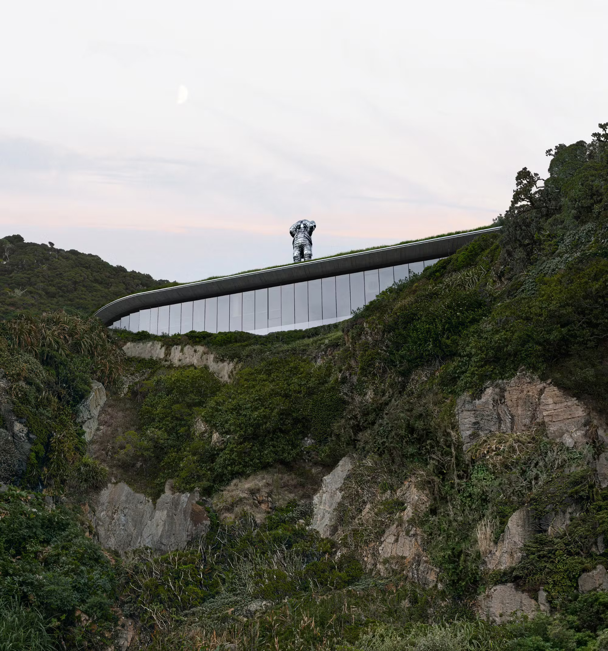 这栋 GUESTHOUSE 是东京地区第一家 NOT A HOTEL 住宅,建于千叶县富津海岸的悬崖顶部,透过落地窗可欣赏到东京湾和富士山的壮丽景色。NIGO 引领了住宅的创意方向,并亲自监督整栋房子的建造细节。他在住家中放置由 Jean Prouvé 和 Pierre Jeanneret(两位 NIGO 最喜欢的设计师)设计的复古家具、来自 OJAS 的扬声器、HUMAN MADE 的大鸭子,以及与私人度假屋相同的睡眠舱。而在建筑外部,NIGO 则与长期伙伴 KAWS 合作,创造了一个高耸于住宅之上的巨型雕塑,即便住宅位置隐秘,但屋顶上的 KAWS 雕塑却非常显眼。