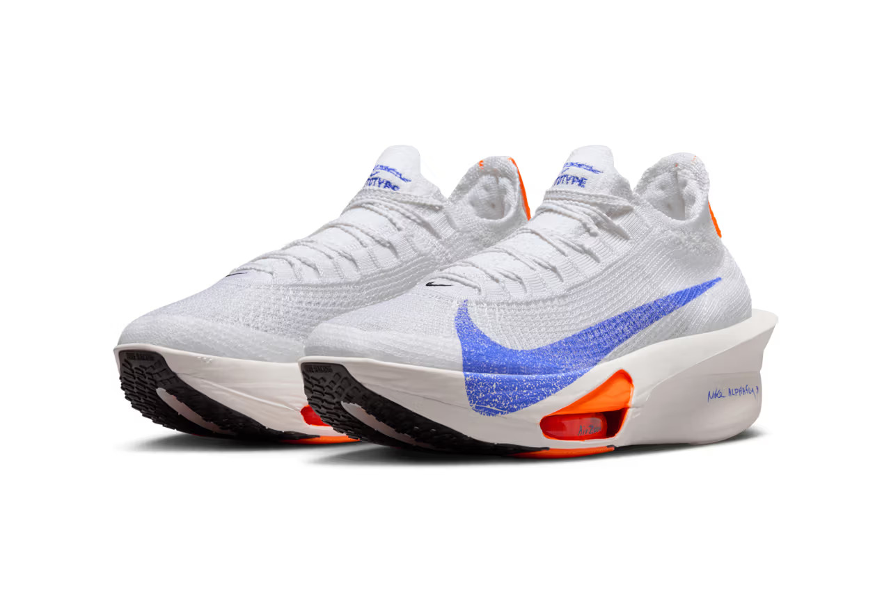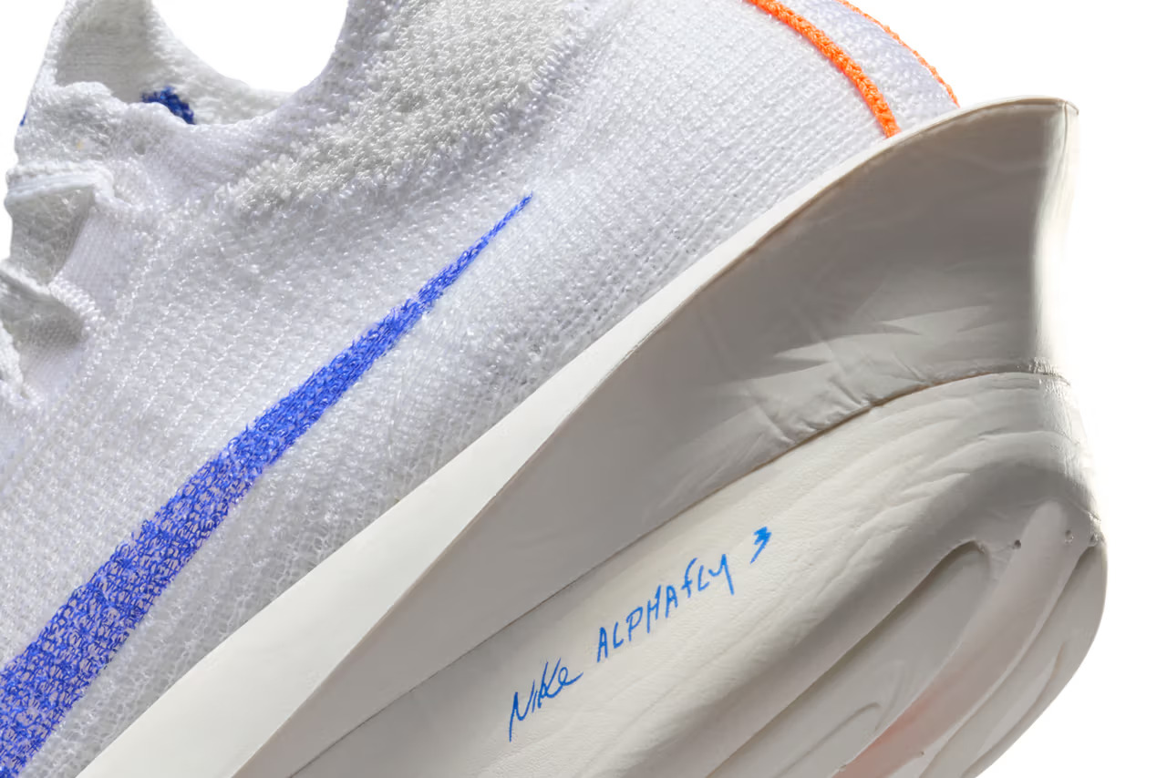 尽管 Nike 涉足许多领域,但其根源与跑步密不可分。Alphafly 系列源于 2016 年,专为马拉松运动员量身定制,时至今日已然改变游戏规则。Blueprint 配色结合白色、蓝色和橙色,为进一步增强“蓝图”主题,其设计线索藏匿于中底、鞋舌、鞋板和鞋面上的伪手写标记,以及鞋垫上印制的 “Prototype” 字样——来自已故耐克联合创始人 Bill Bowerman 。