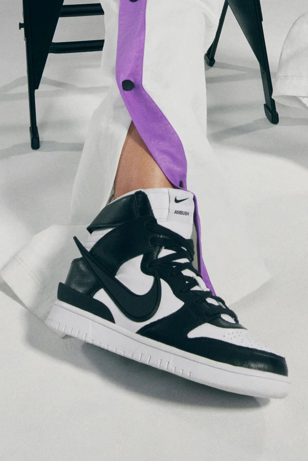 合作系列中的 NIKE DUNK HIGH x AMBUSH 以经过重塑后的元年款版型呈现,并融入日本机车、汽车和卡车的文化元素,SWOOSH 标志从鞋跟处向外延伸,如同机车排气管,使得鞋款在外观上更加修长挺拔。