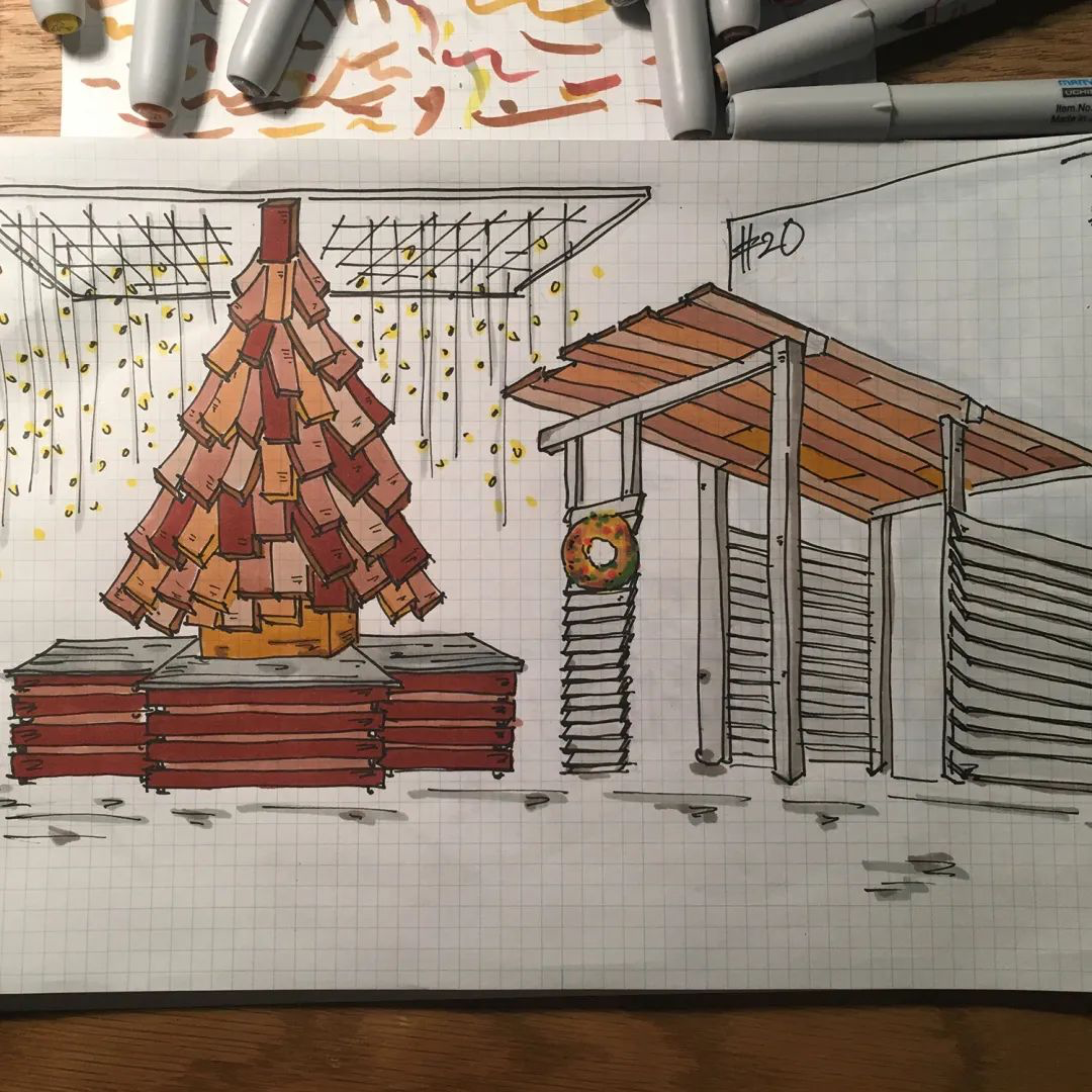 在尝试了木箱树和白桦树之后,三年前我们制作了木板块拼成的圣诞树。尽量不花太多的费用,使用现有的或是要被丢弃的材料,集思广益并付出心血,并抱着可以让在明治大街来来往往的人们看到后感觉 “马上就是今年的圣诞节了呀”的这种心情去制作。