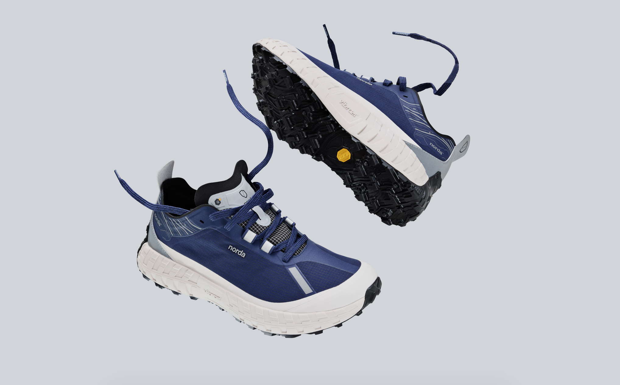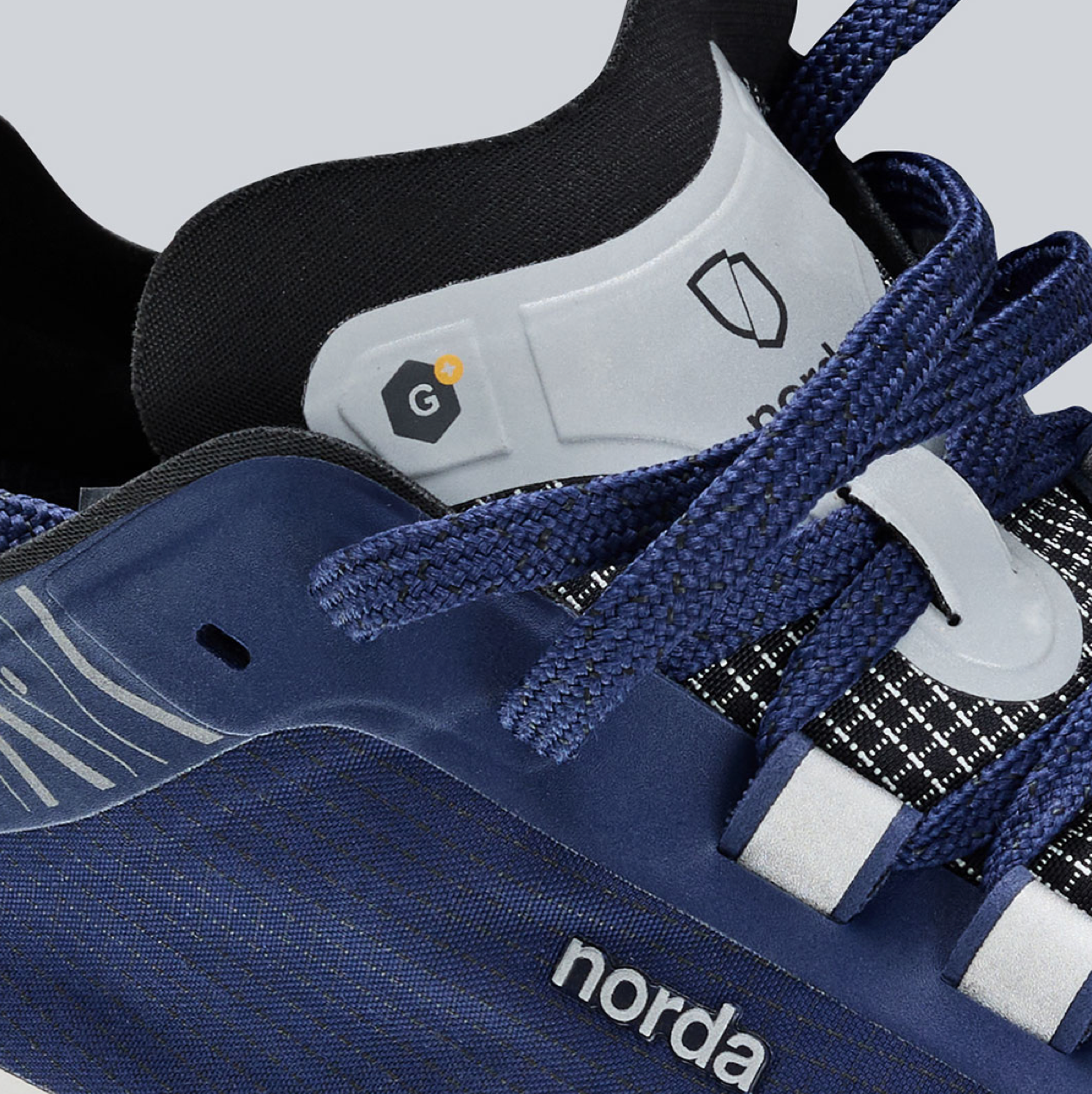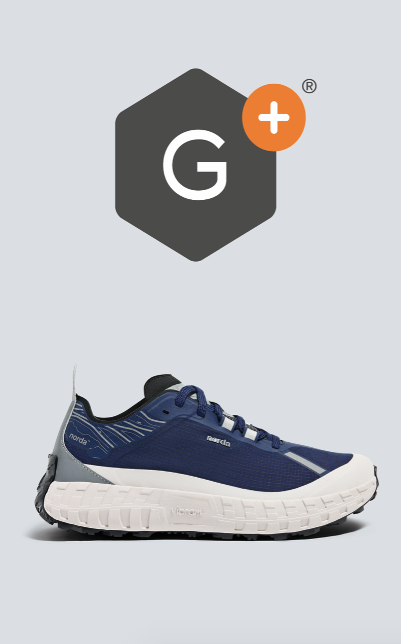 延续001轻质耐用的生物基 Dyneema® 鞋面,与稳定抗滑的 Vibram® 鞋底,同时创新加入一层温度调节并由石墨烯制成的拒水膜,助力跑者自如应对极端天气。深蓝色鞋面与白色压胶组合,点缀银色反光后跟与带有山脉轮廓的鞋领。鞋舌上附有“G+®”标志,突出冬日硬核配置。