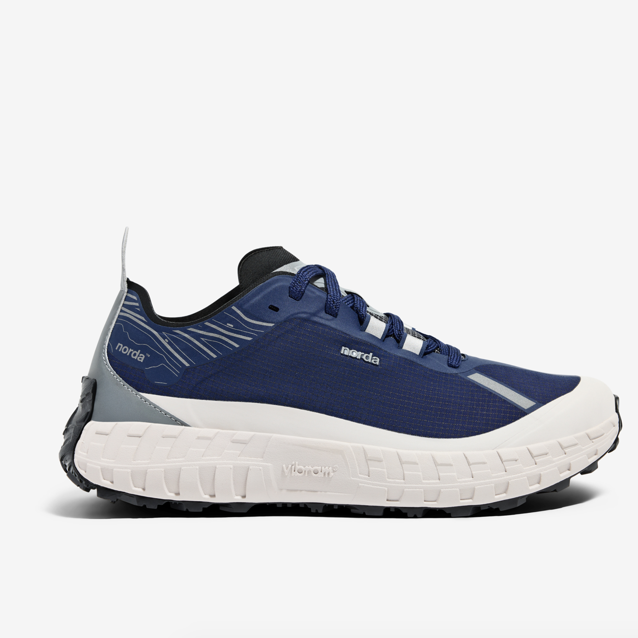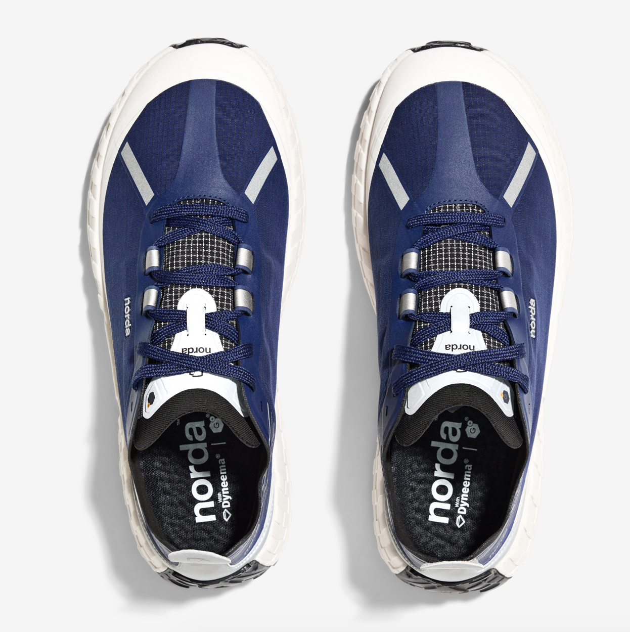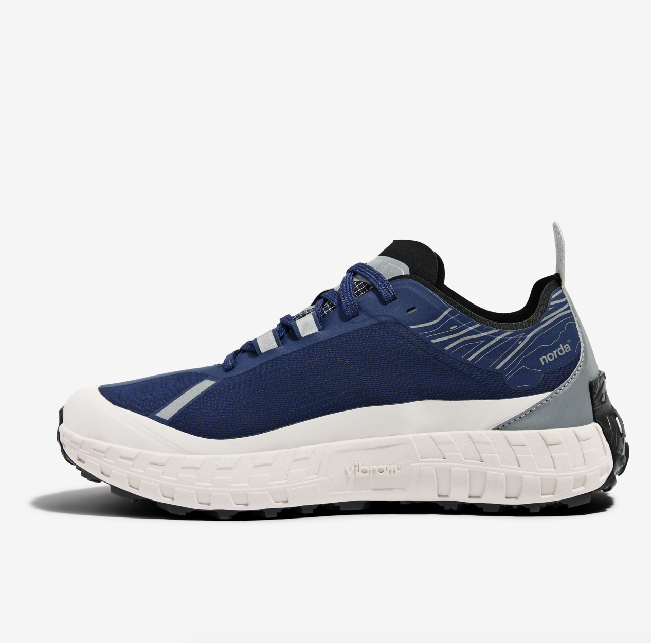 延续001轻质耐用的生物基 Dyneema® 鞋面,与稳定抗滑的 Vibram® 鞋底,同时创新加入一层温度调节并由石墨烯制成的拒水膜,助力跑者自如应对极端天气。深蓝色鞋面与白色压胶组合,点缀银色反光后跟与带有山脉轮廓的鞋领。鞋舌上附有“G+®”标志,突出冬日硬核配置。