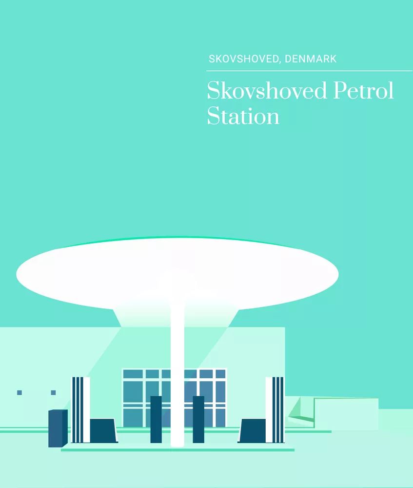由丹麦现代主义设计代表人阿纳·雅各布森设计的加油站,白色的瓷砖营造了简单优雅的氛围,椭圆形顶盖的形状,是设计师由大自然中的椭圆形树冠获得的灵感。