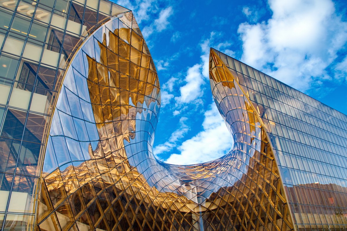 瑞典Emporia购物中心,2012瑞典Wingrdhs建筑设计事务所👈左滑查看实景Emporia购物中心这块完美的巨大凹陷表面,是由无数块双曲面玻璃组成的,弧度近乎完美,又像是流淌的黄金,玻璃倒映着蓝色的穹顶,四周之景不断流转,犹如黄昏降临的北欧神殿,美得令人惊叹。