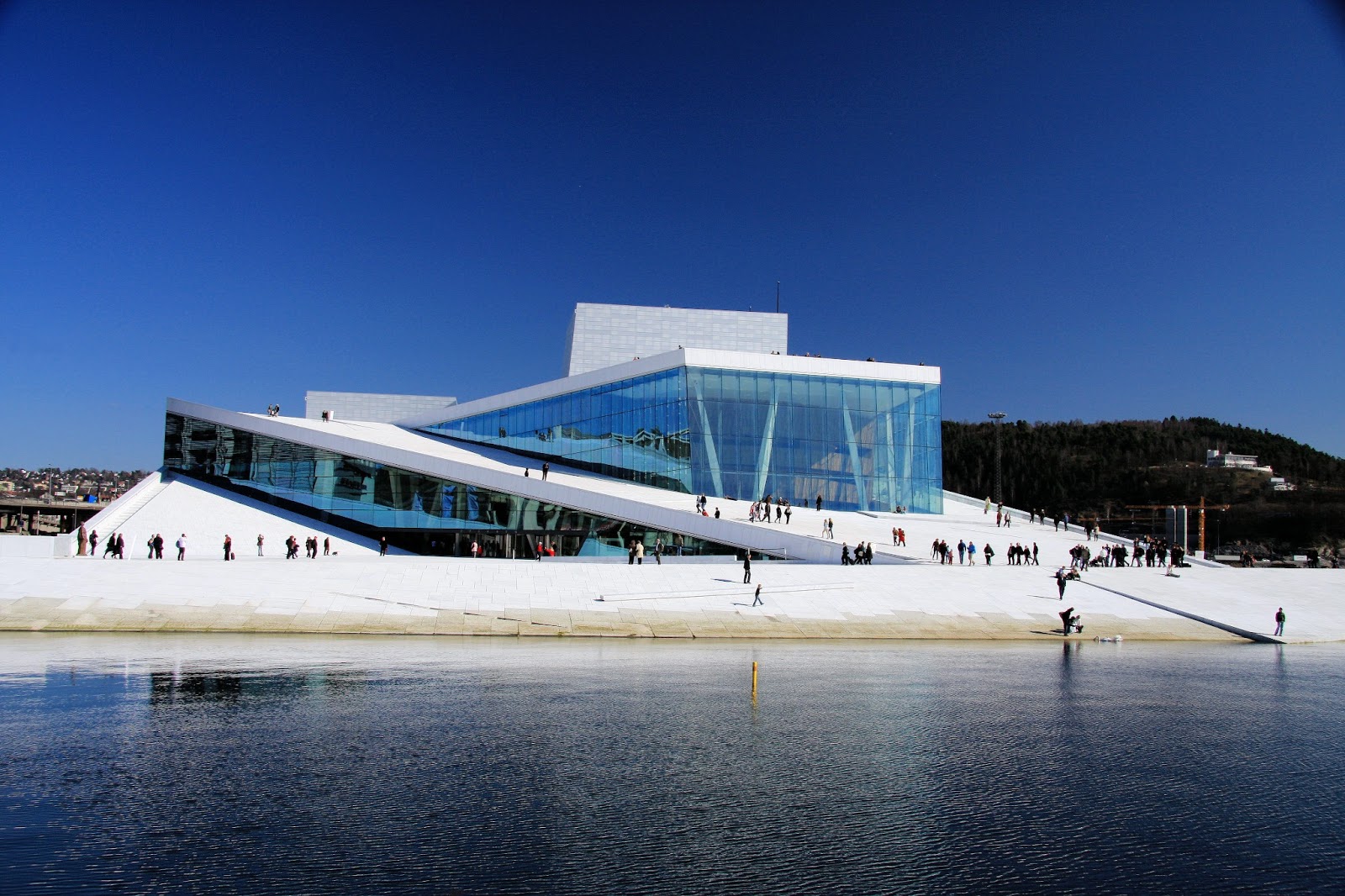奥斯陆歌剧院依附着奥斯陆峡湾,看上去像一艘等待出海的帆船。白色的倾斜石制屋顶从奥斯陆峡湾拔地而起,游客们在屋顶悠闲漫步,欣赏海湾美景。