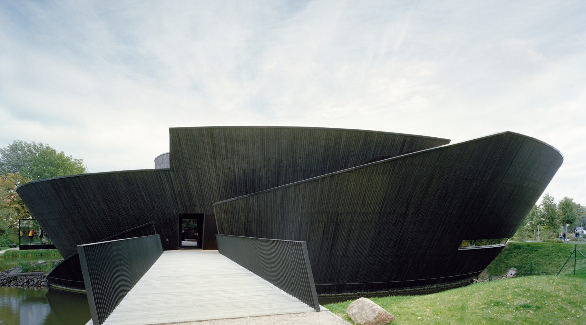Müritzeum游客中心像孤立于湖中央的一个半岛,整个建筑倾斜的外表向四面延伸,从远处看它又像一个巨大的诺亚方舟,承载着人类的希望。