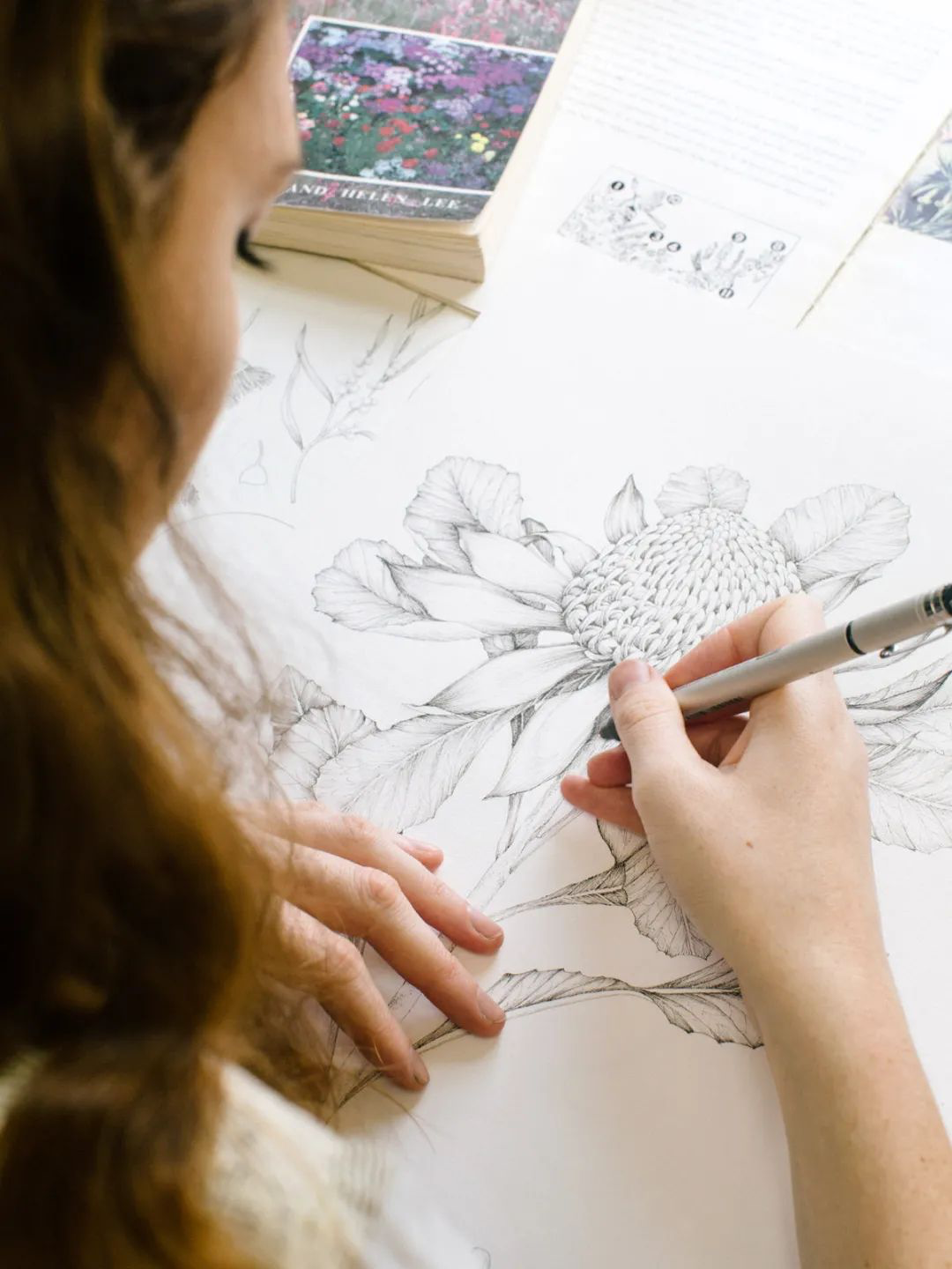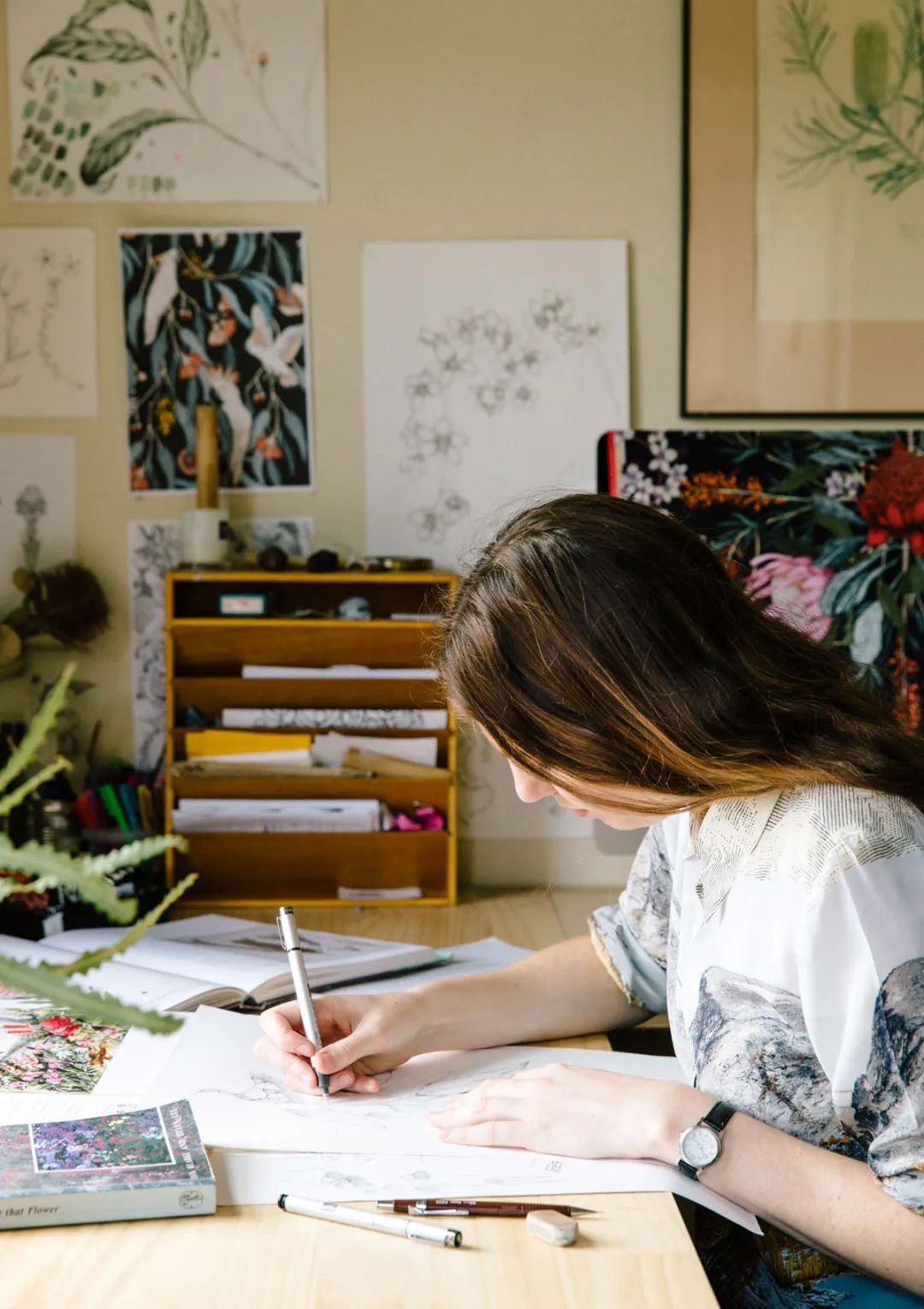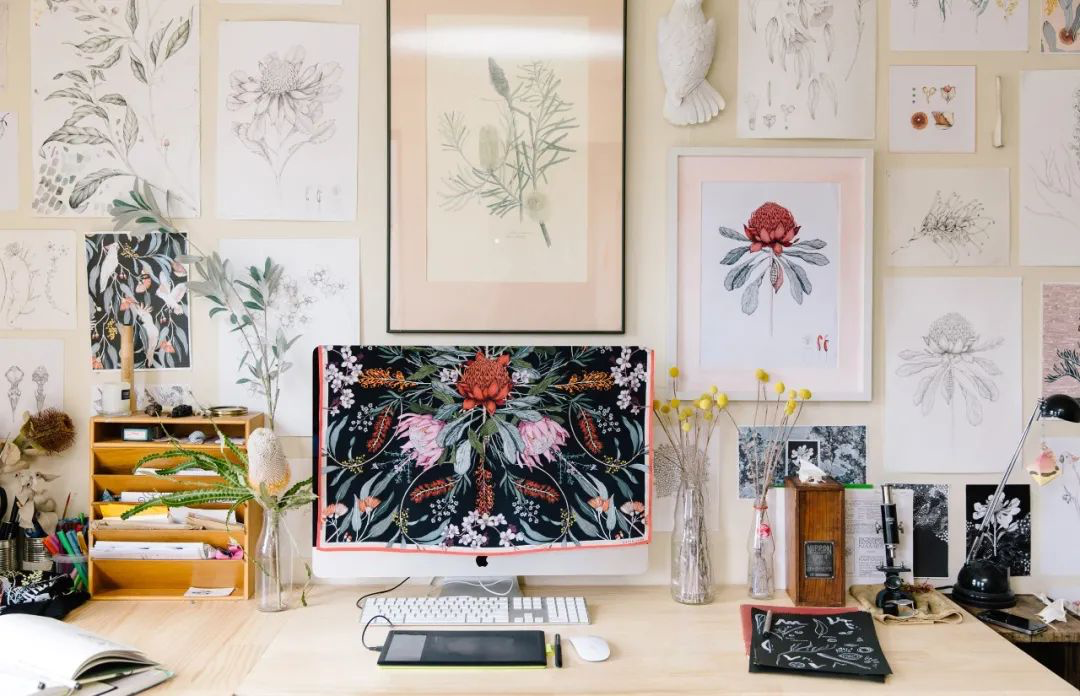 Edith Rewa擅长使用钢笔和毛笔作画,她能轻易将从植物中获取的想法变成插画,最后再把画作和商业织物结合在一起。这样看来,在搭建自己的工作室之前,去一个正式的商业工作室看看也是一个不错的选择。