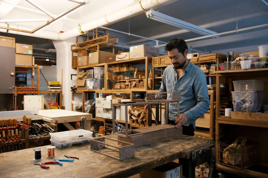 Jonah Takagi的爸爸是日本人,妈妈是美国人,出生在东京。回到美国之后,在叔叔的鼓励下去上了艺术学校。Jonah很喜欢传统的歌曲创作,所以他一直在从事跟音乐相关的工作。除了音乐创作,他也会和女友的乐队一起在工作室的地下室里练习表演。三十岁以后,Jonah想让自己的职业方向更为明确,受建筑师爸爸的影响,在妈妈的鼓励下开始尝试产品设计。Jonah很自然地被家具设计所吸引,他认为家具设计还能满足他用自己的双手做东西的愿望,它也和建筑行业相关。如今,他非常稳定地在自己的工作室Atelier Takagi工作。