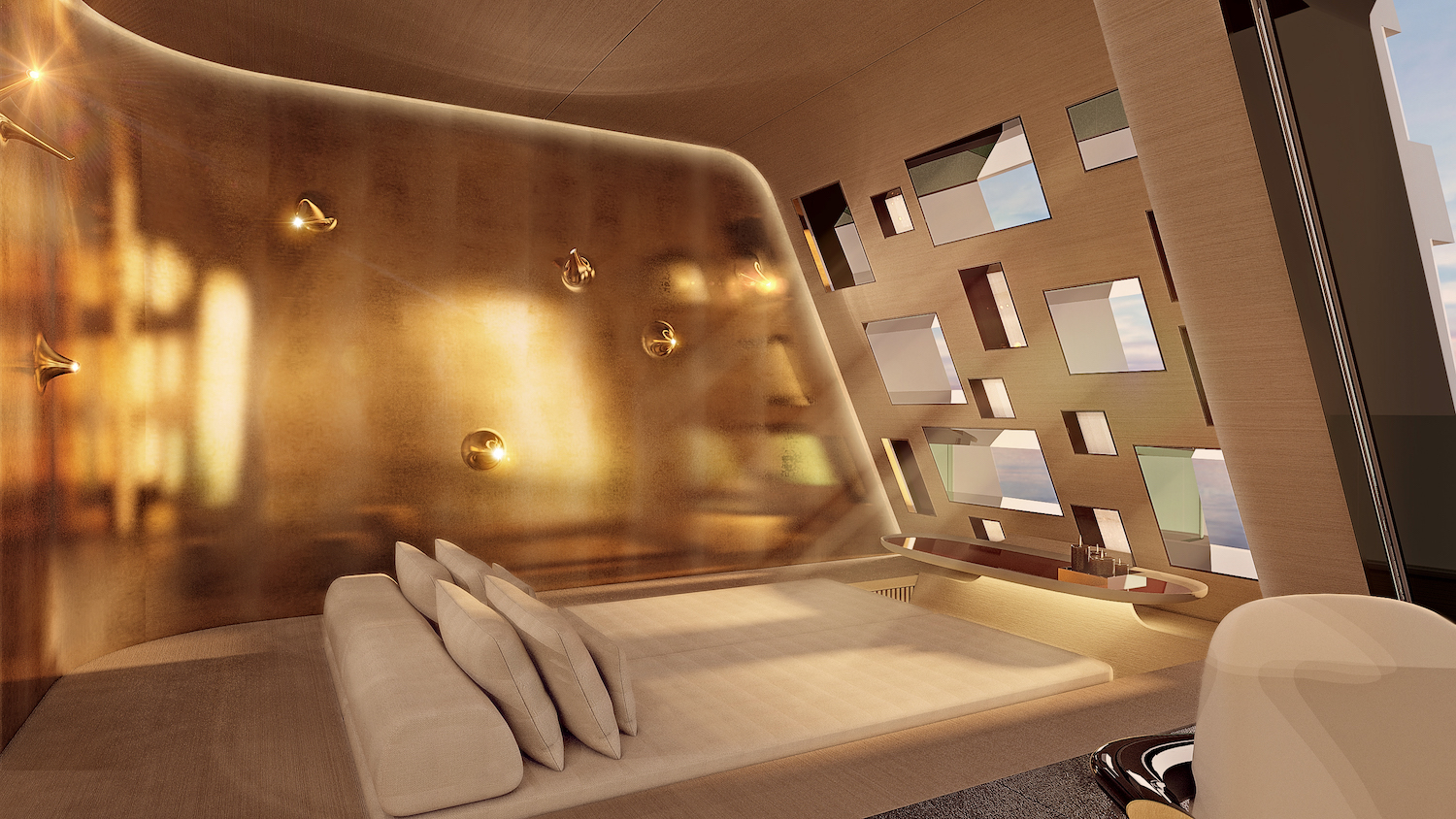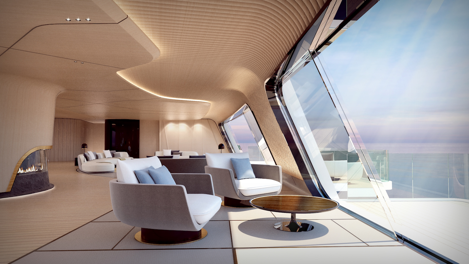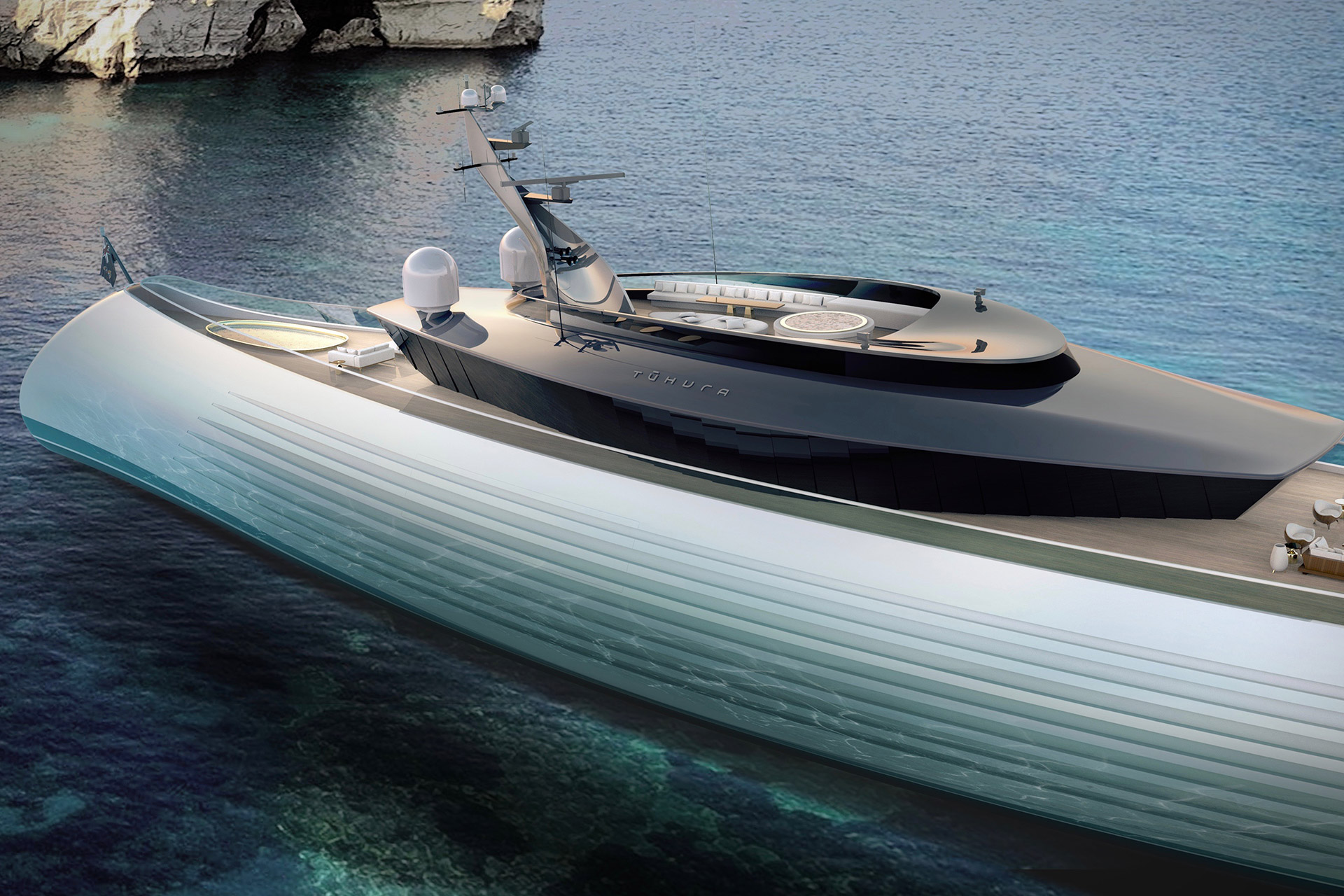 借用古代灵感,延续现代设计思维是Tuhura的制造宗旨。内部装饰上极为奢华,采用了大量原木和青铜设计,无论是私人酒吧、起居室、以及娱乐聚会场所应有尽有。总长度达到了115米,时速可达33公里/时。设计师希望Tuhura在海上行驶的途中,犹如一个动态的开拓者,但由于其庞大的造型,却又能呈现出一种宁静而永恒的特点。这种具备原始性的风格除了可以体现出整个游艇的优雅性感之外,也表现了每个人对于大海的敬畏之情。
