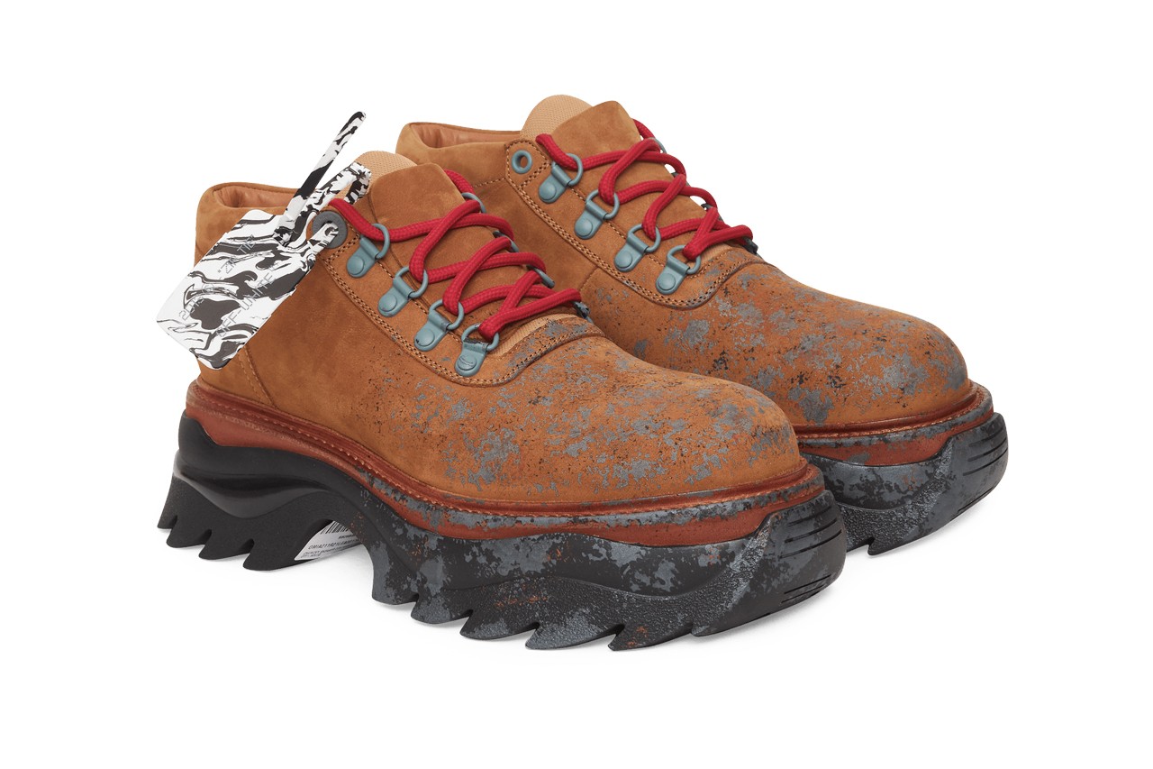 第一印象就给人以激进、张扬、霸气的感官体验,以棕色调皮革鞋面搭配脊状波浪形黑色外底,辅以前掌部位故意做脏的灰色喷溅设计,就连标志性的印刷标签也被渲染为大理石图案风格,外加其他精彩细节如金属 D 形环孔眼、贯穿其间的红色绳带以及呈现于后半部的 Off-White™ 小徽章,这双 Ridged Sole Lace Up Sneakers 的整体可谓充满凝聚力和原创性,而且看起来非常耐脏!感兴趣的朋友,可以去 Slam Jam 为自己买上一双。