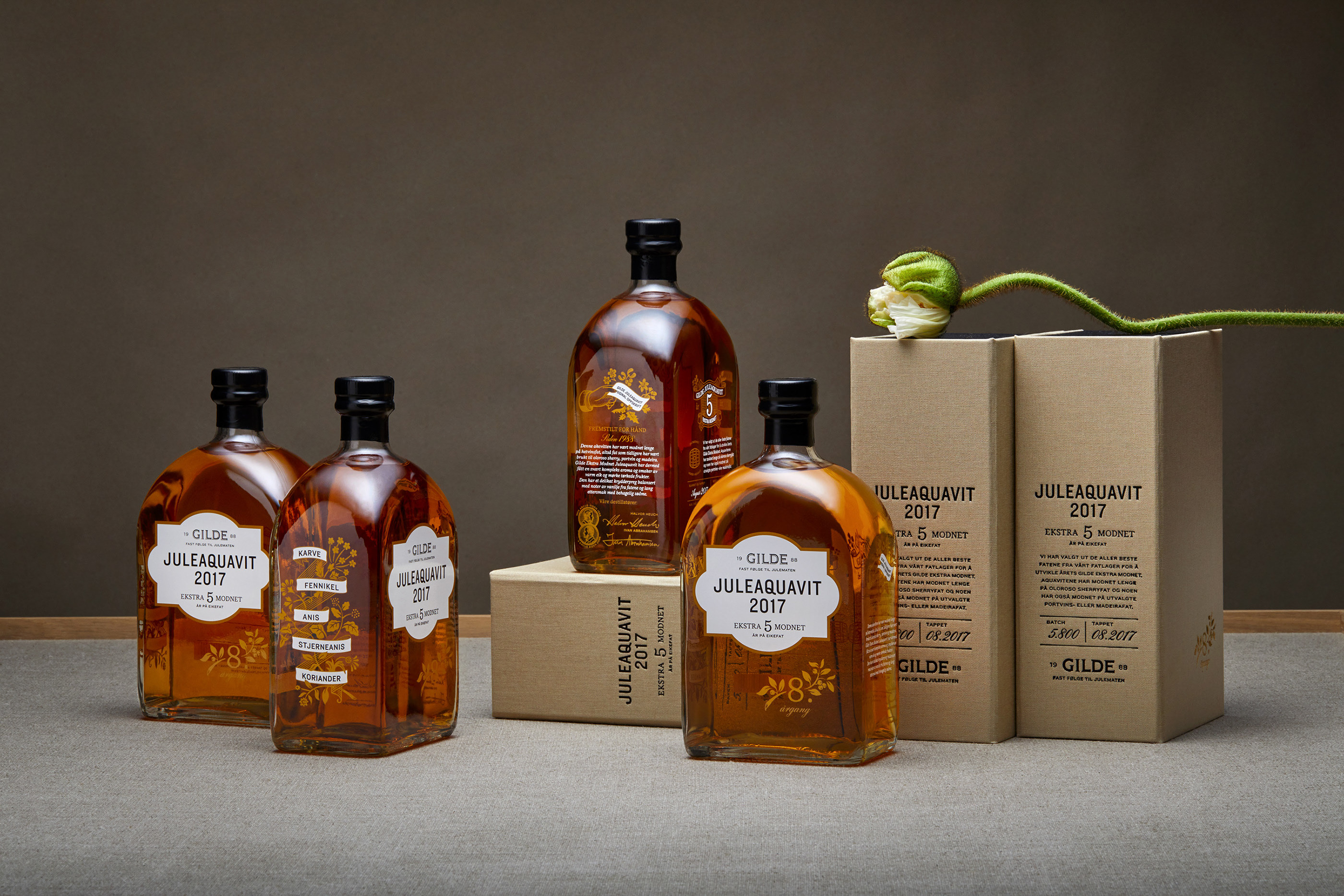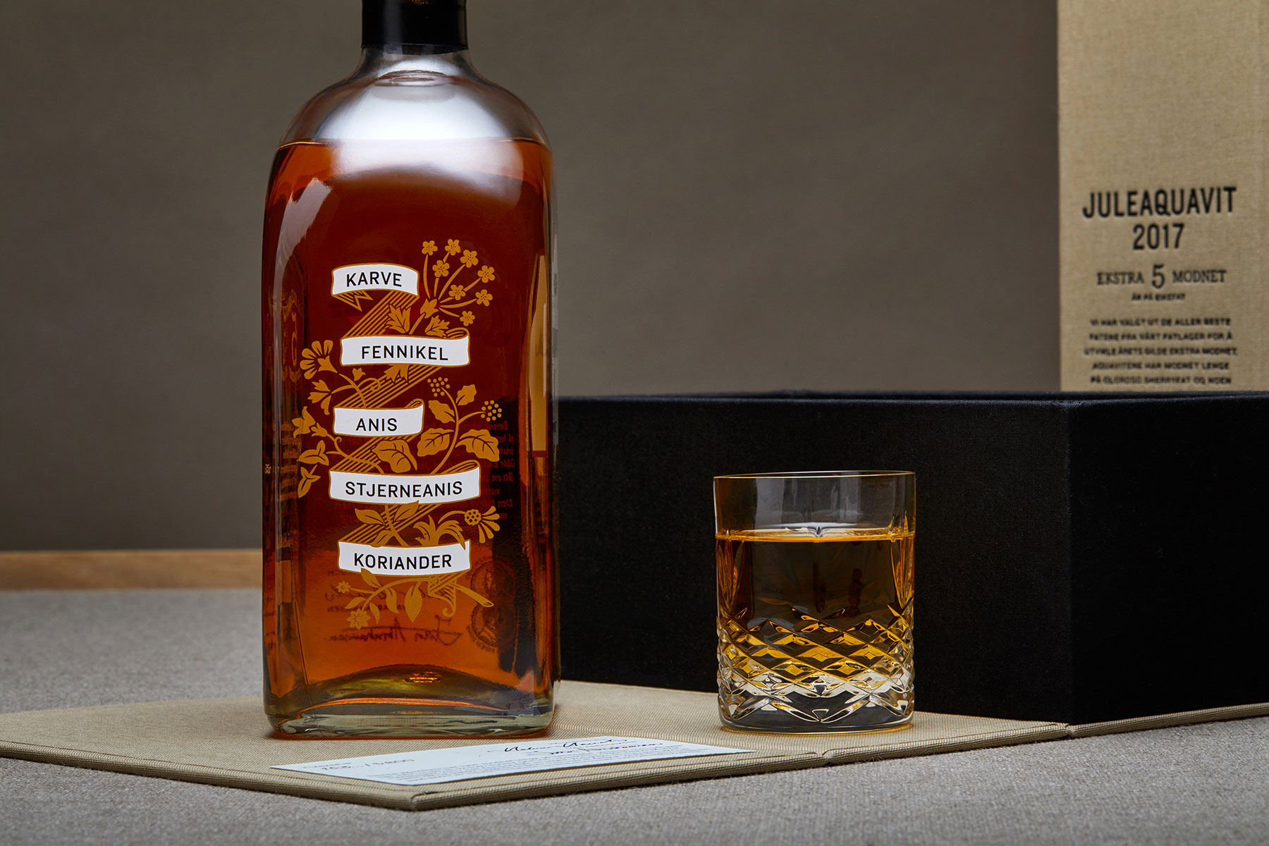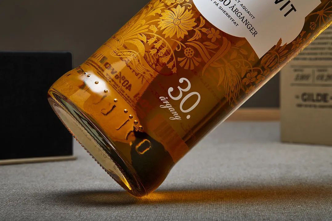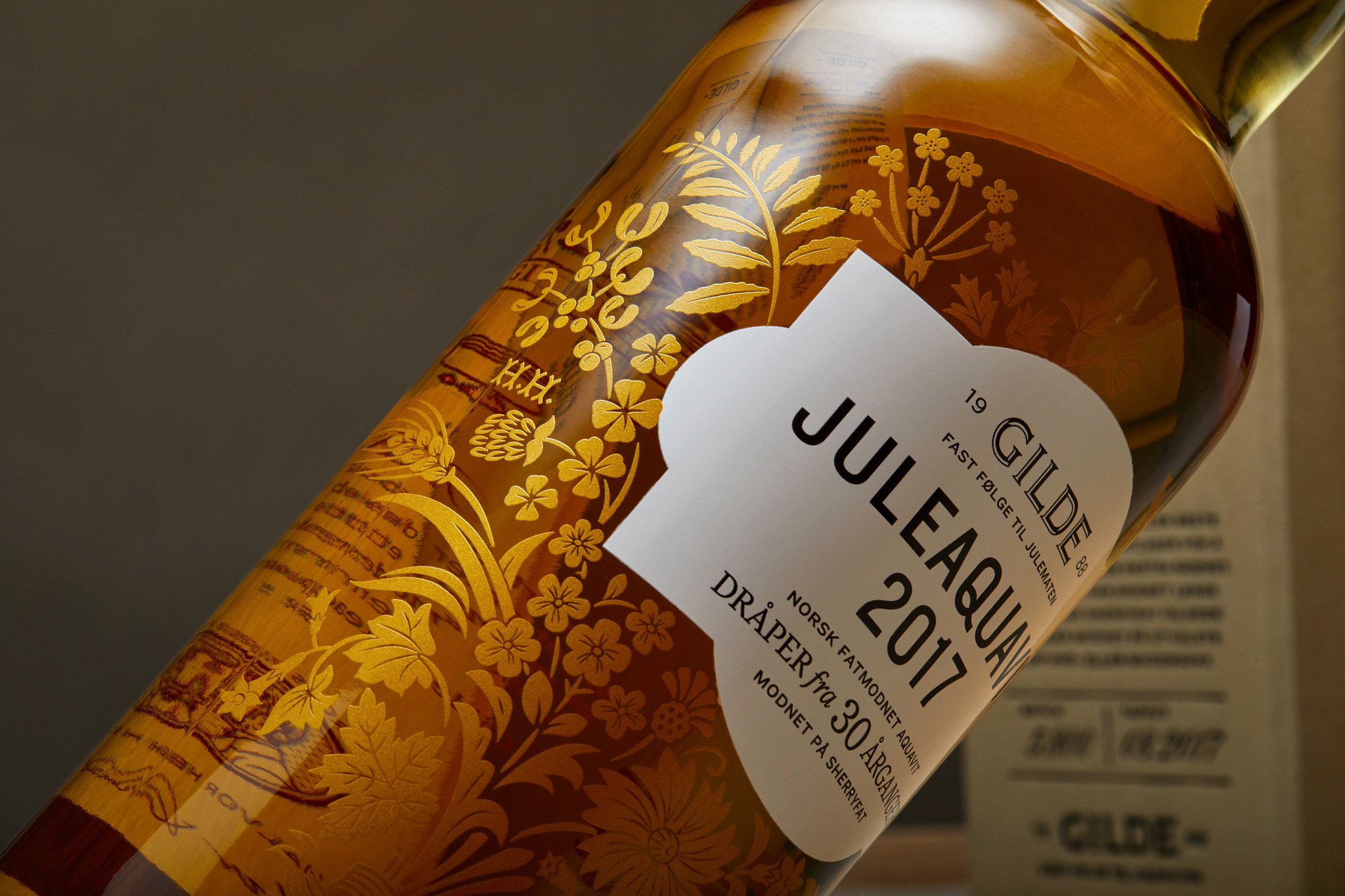 Gilde Juleaquavit是一款诞生于1988年的挪威圣诞烧酒,有着独特的雪梨橡木桶香气和金黄的色泽。OB工作室参与设计的是三十周年纪念瓶,但对于北欧设计来说,即使是周年纪念,整体给人的感觉也十分含蓄。瓶身正面是低调而精致的花朵暗纹,代表着古老传统的感恩之情,侧面同样装饰着花束和白色丝带,代表庄重的纪念。