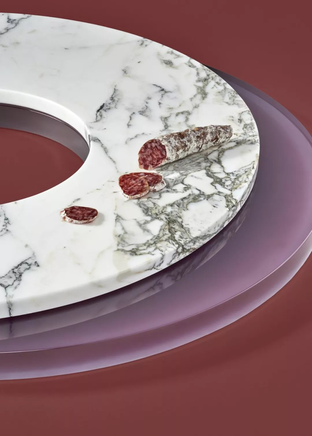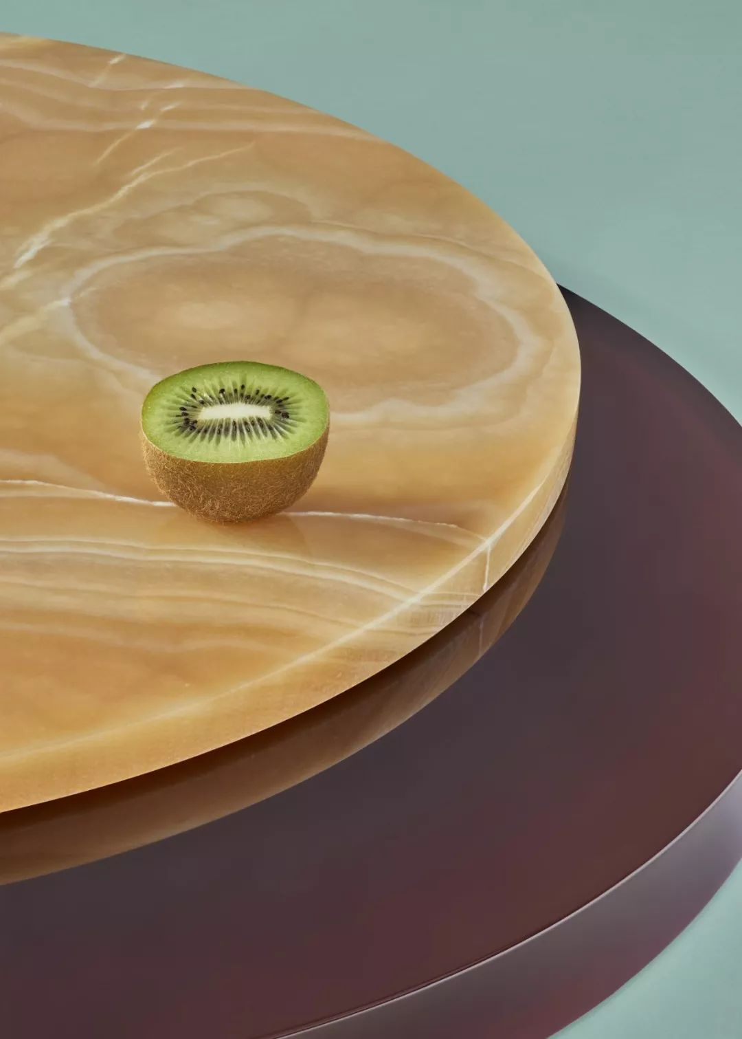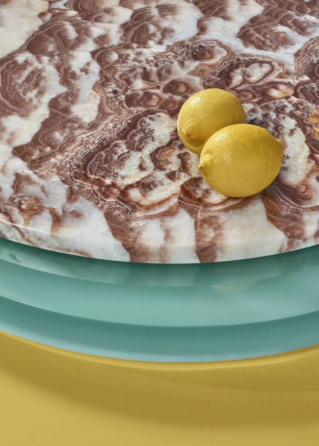 在中国人的餐桌上市场出现的旋转玻璃菜盘,在这里成了用树脂材料创造出的美好存在。轻盈的半透明材质与有着美丽花纹的圆盘之间,形成了非常独特的美感。