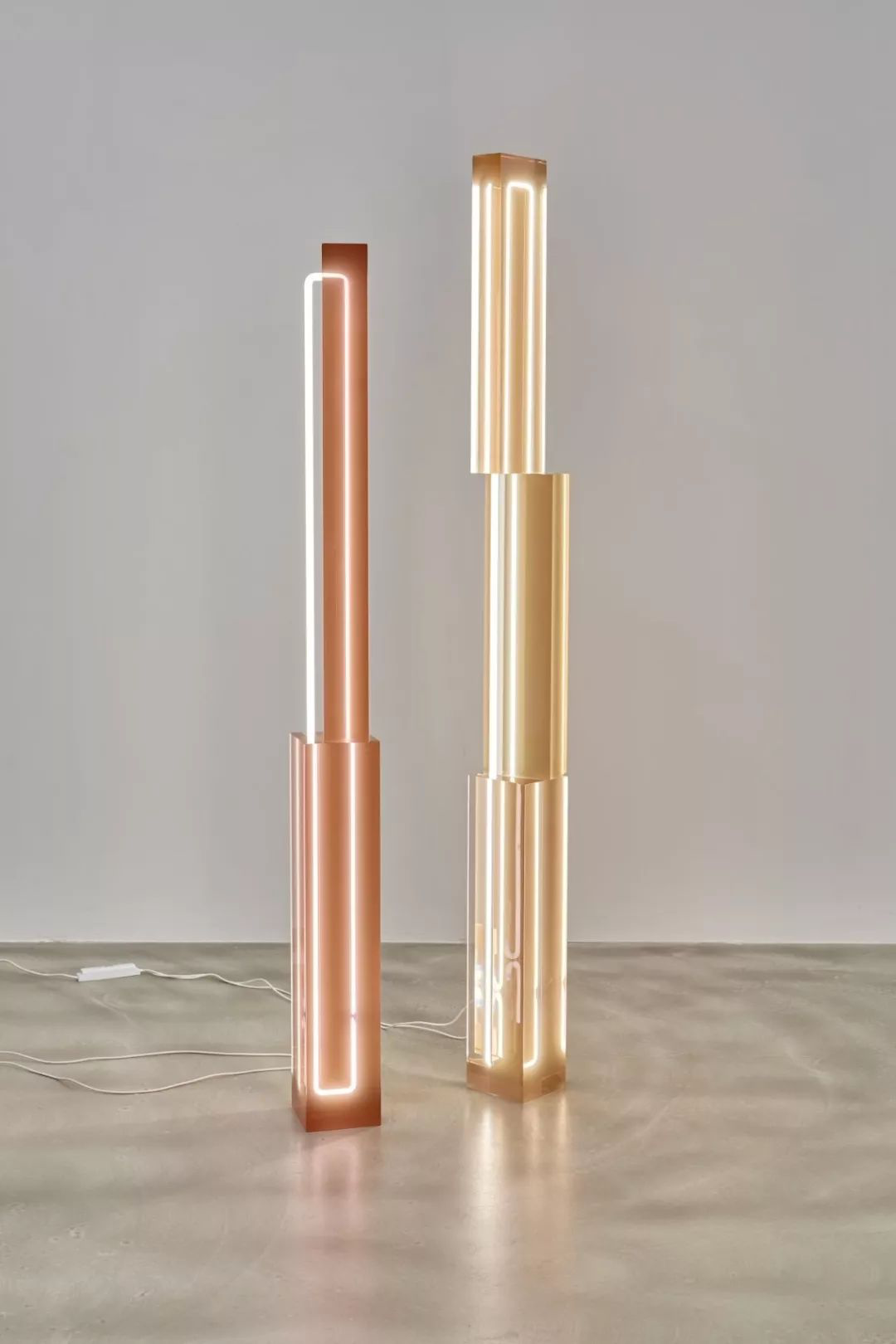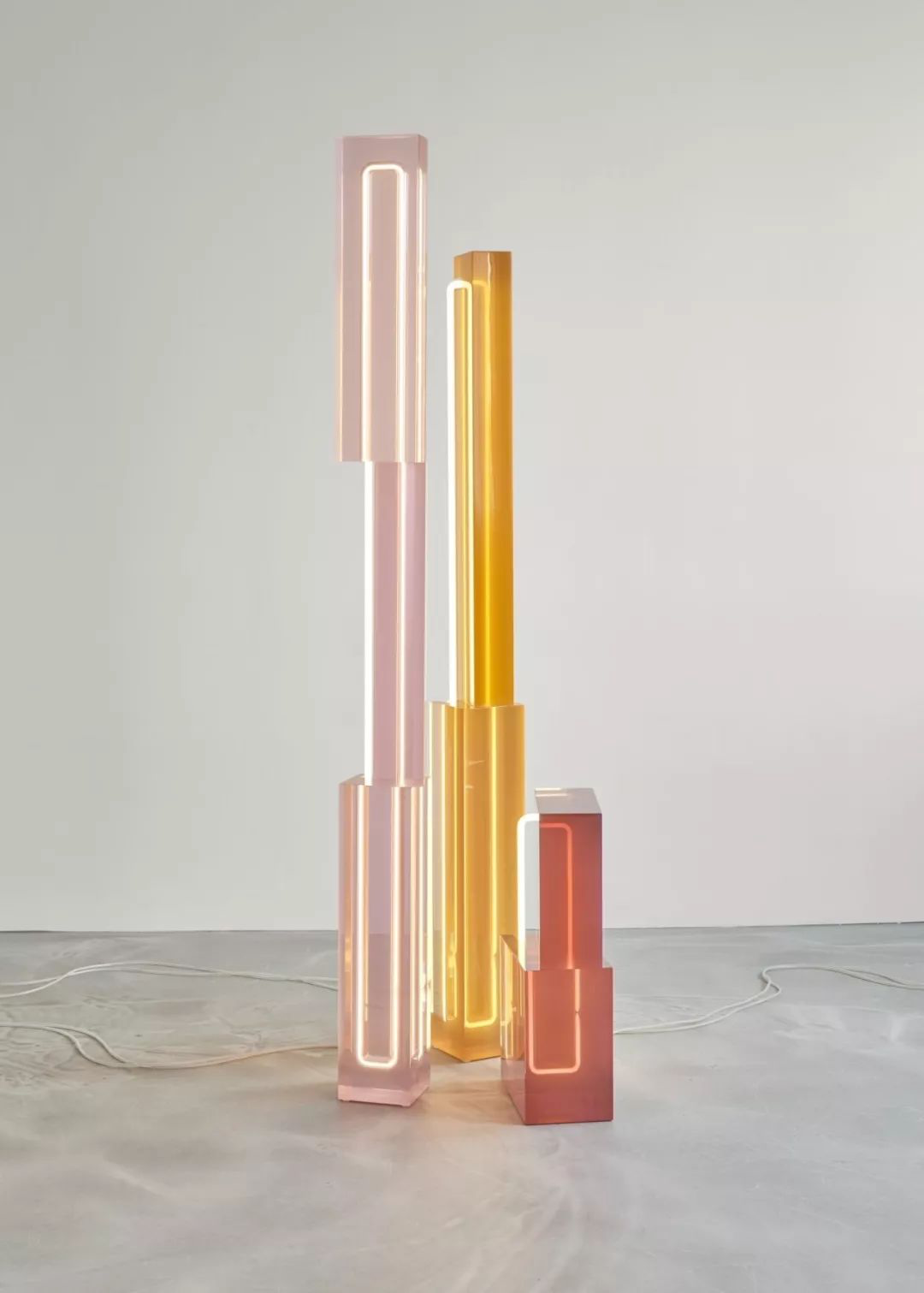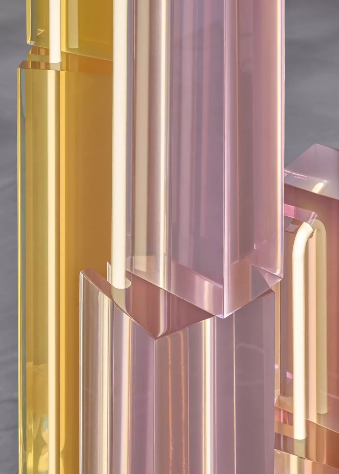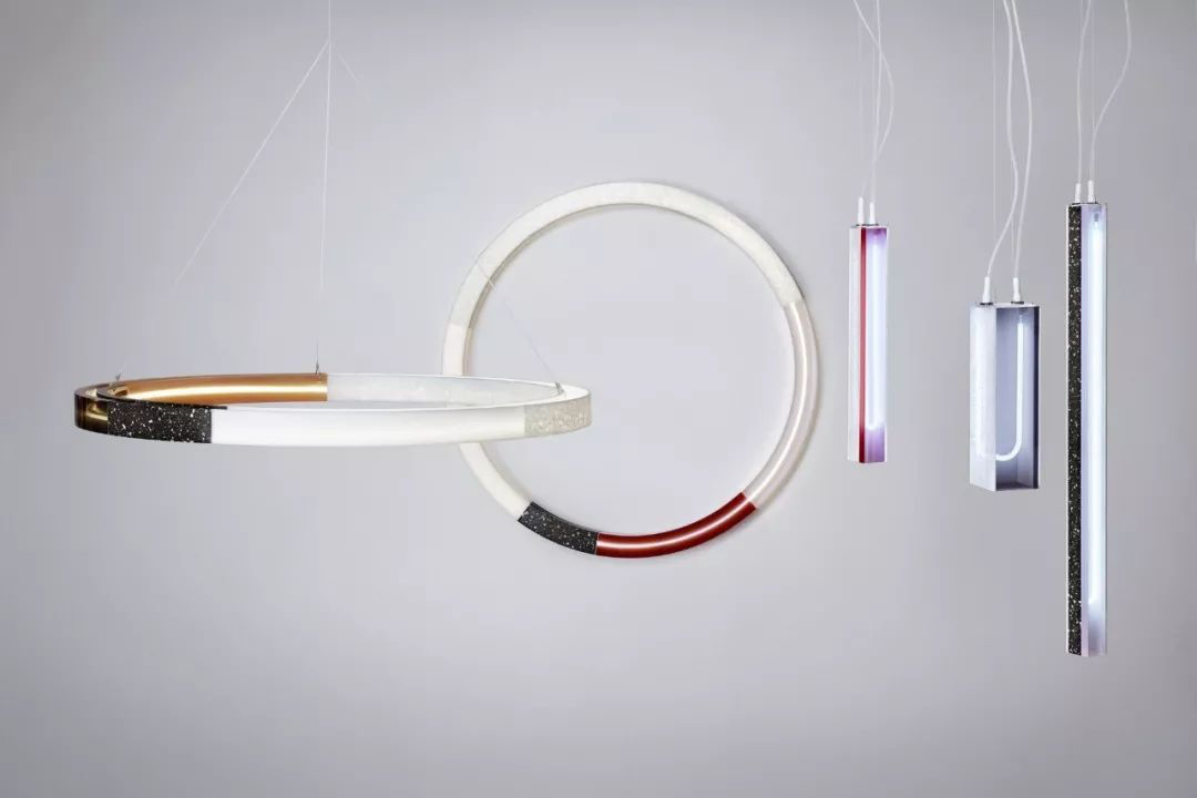 这组作品的灵感来源于黎明时分的场景。设计师探索了光线与色彩之间的关系,你能感觉到天上云朵与天空合二为一的短暂时刻,美好而精彩。这个系列发挥了光、色、透明度和饱和度之间的各种关系,利用嵌入在浇铸树脂中的单个白色霓虹灯光,突出了色彩的巧妙操控以及光线的奇妙交汇。