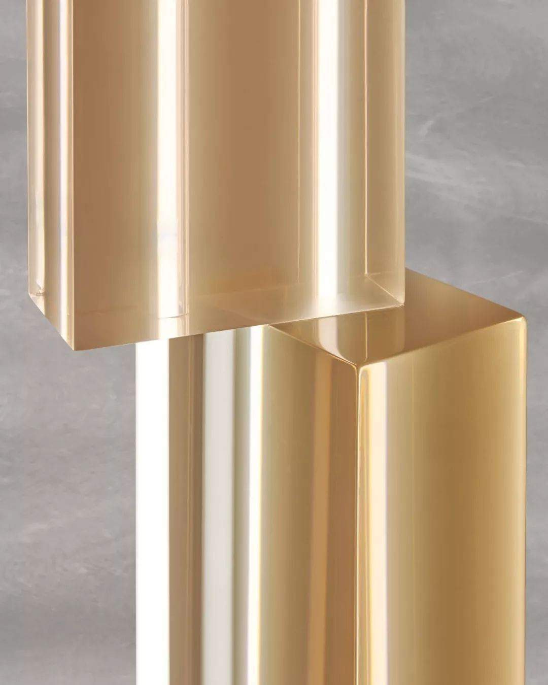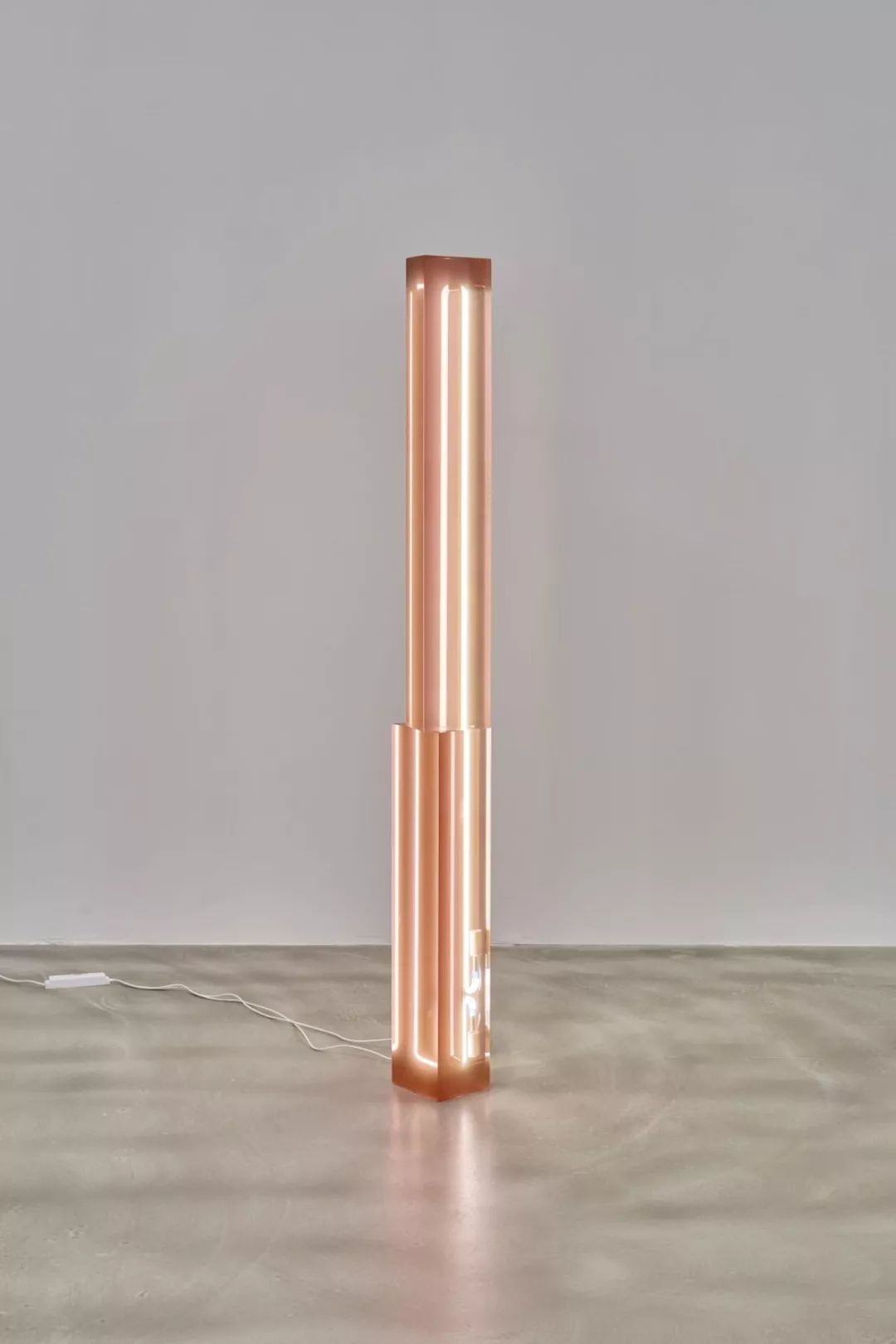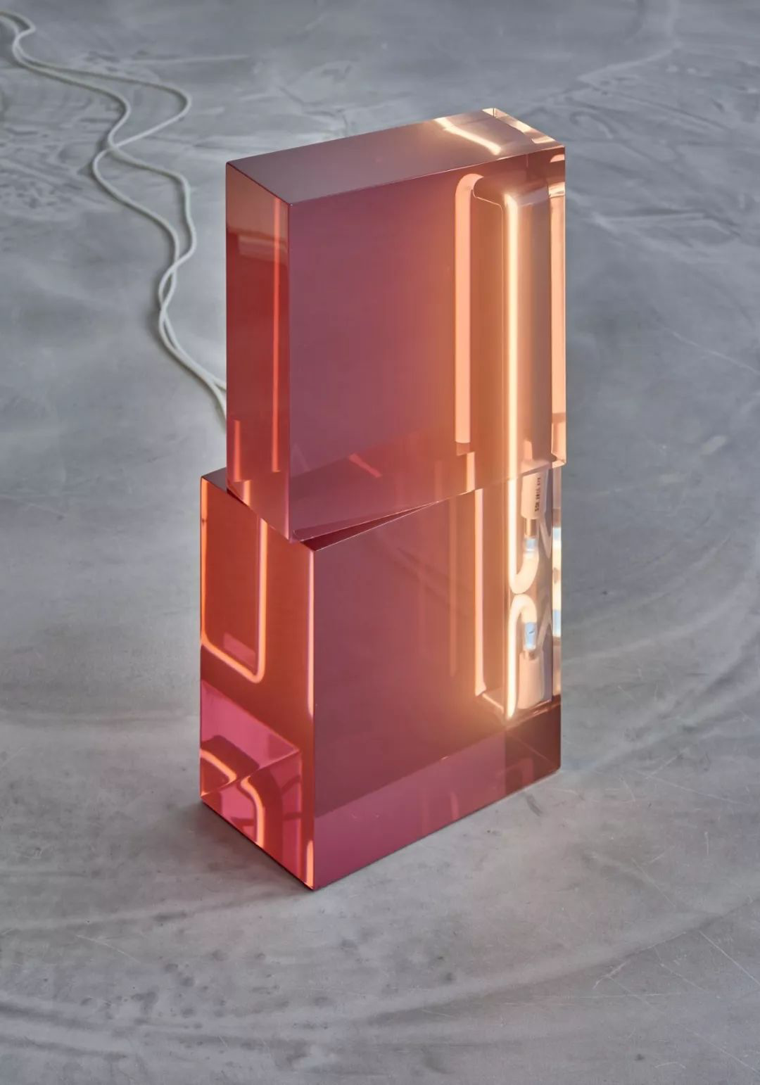 设计师对树脂材料的迷恋从这个作品中可见一斑。利用充满雕塑美感的形体,并采用一种图腾式的外形,将几个堆叠的半透明树脂体积结合成了灯具。霓虹灯插入雕塑的空隙,让灯光在树脂的平面与内里进行反射、折射,形成了独特的视觉体验。