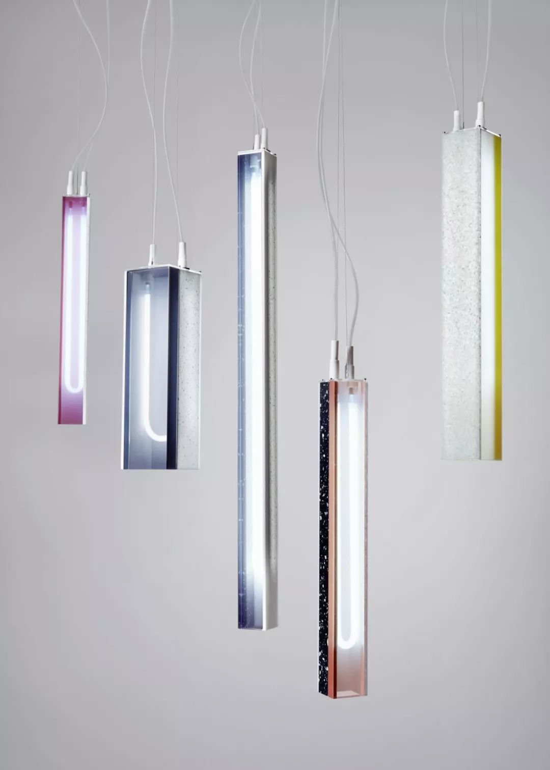 这一组作品名为 Filter,通过利用浇铸树脂材料,设计师将灯具的外形打造成了拥有各种不同特性融合的独特观感。当灯打开时,这些材料与特性才会显示出来。