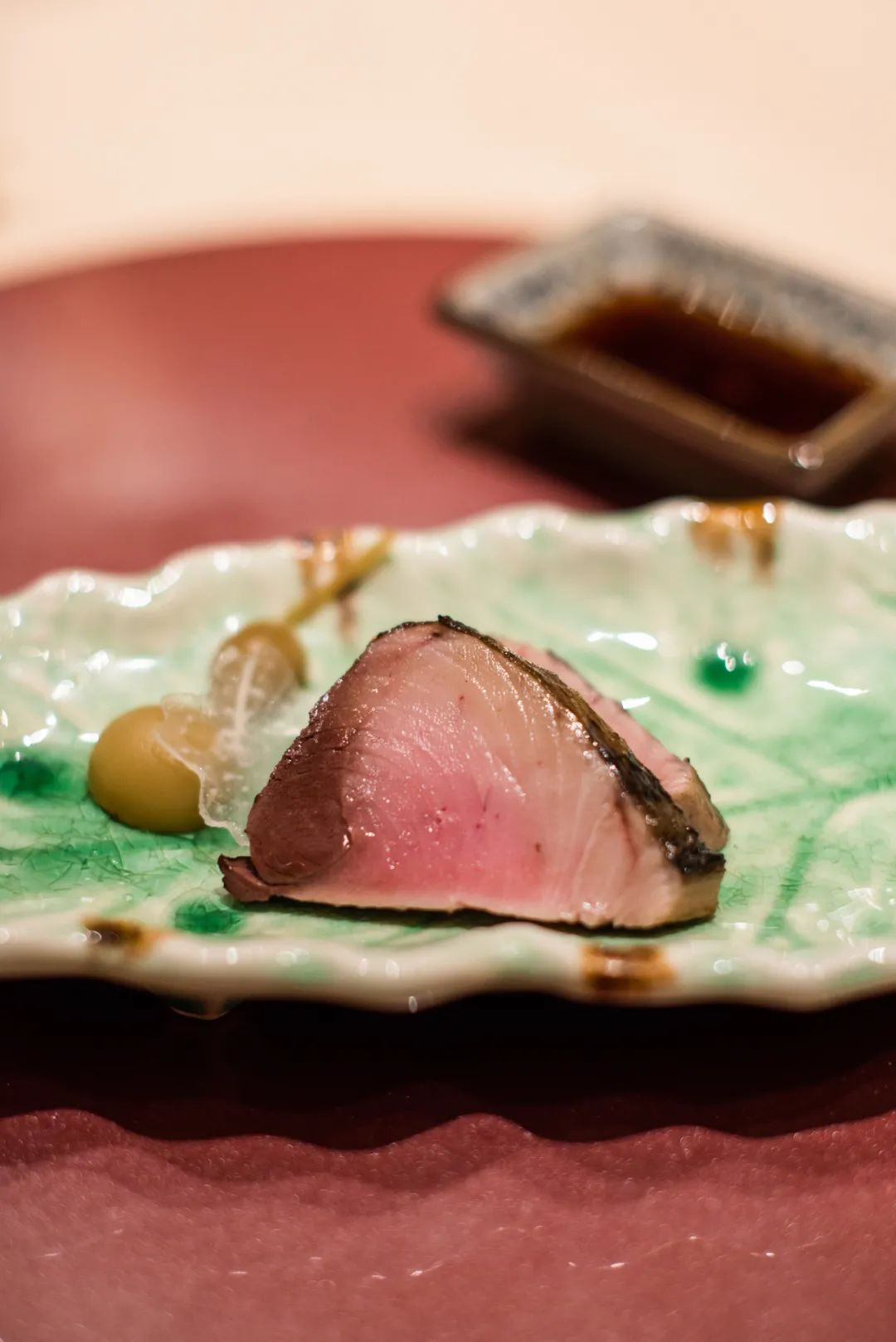 十一月是鲣鱼最好的季节,经过夏秋两季,此刻肥美到了极点,所以称为「梦幻鲣」。在火上燎过,烤出脆皮和烟熏味,内里还是刺身状态,夏天也吃过这道菜,但秋季鲣鱼味道明显更柔顺绵长一些。