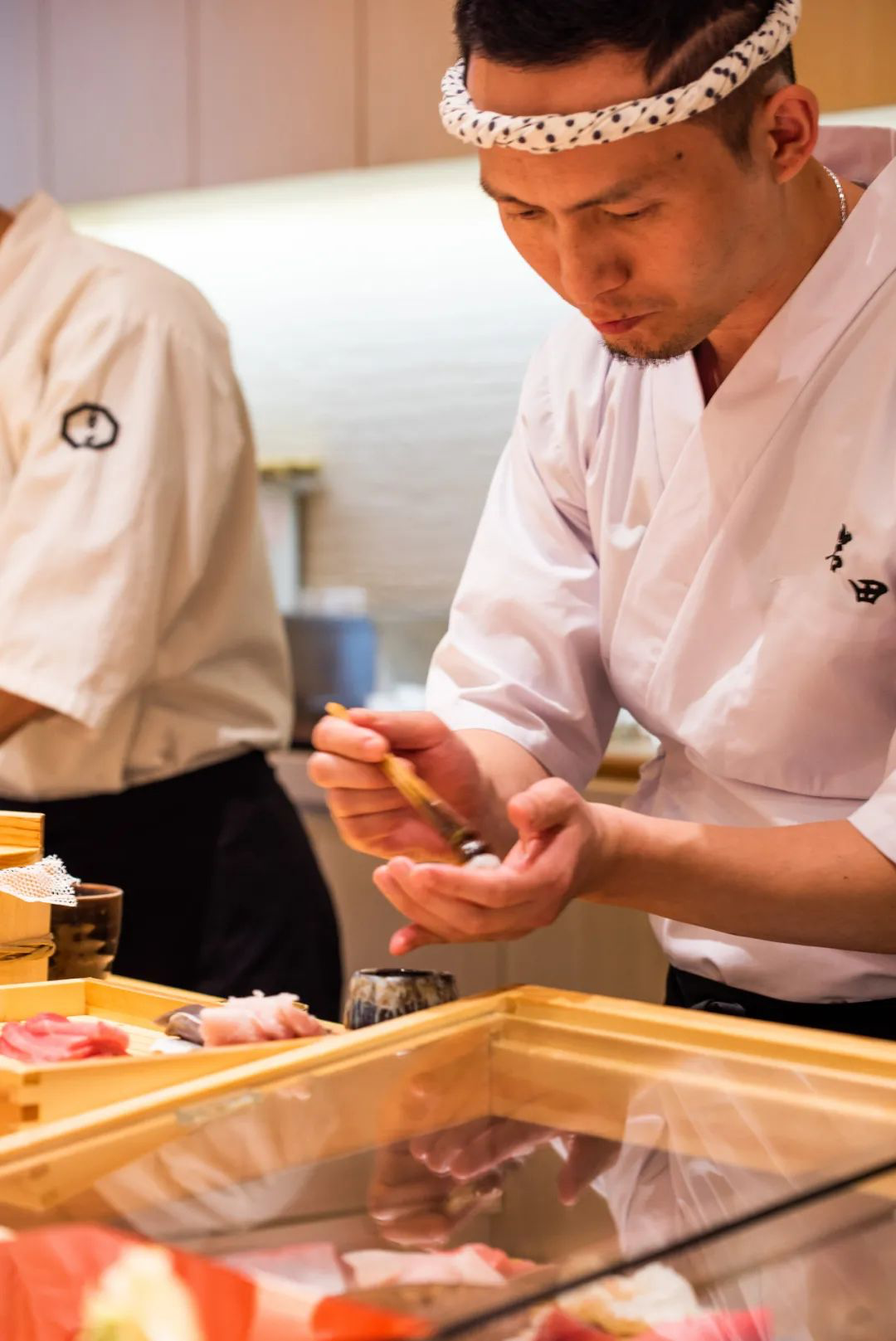 从进店起一直有说有笑的主厨,捏寿司也严肃了起来;还好小舒警告中午一定要少吃,这一套下来足足 10 贯寿司!