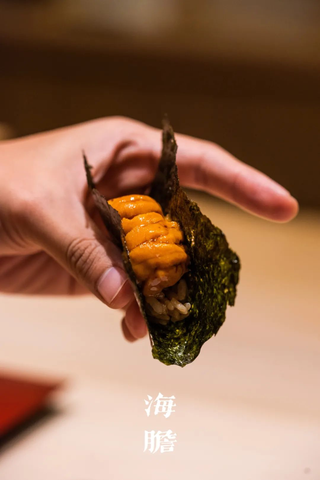 最后是海胆手卷。听主厨说还在钻研调配寿司米的比例,现在离他心中的想法还有些距离,但在我看来,鱼肉与醋饭的配合已达到优秀的一体感。