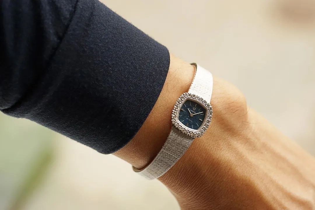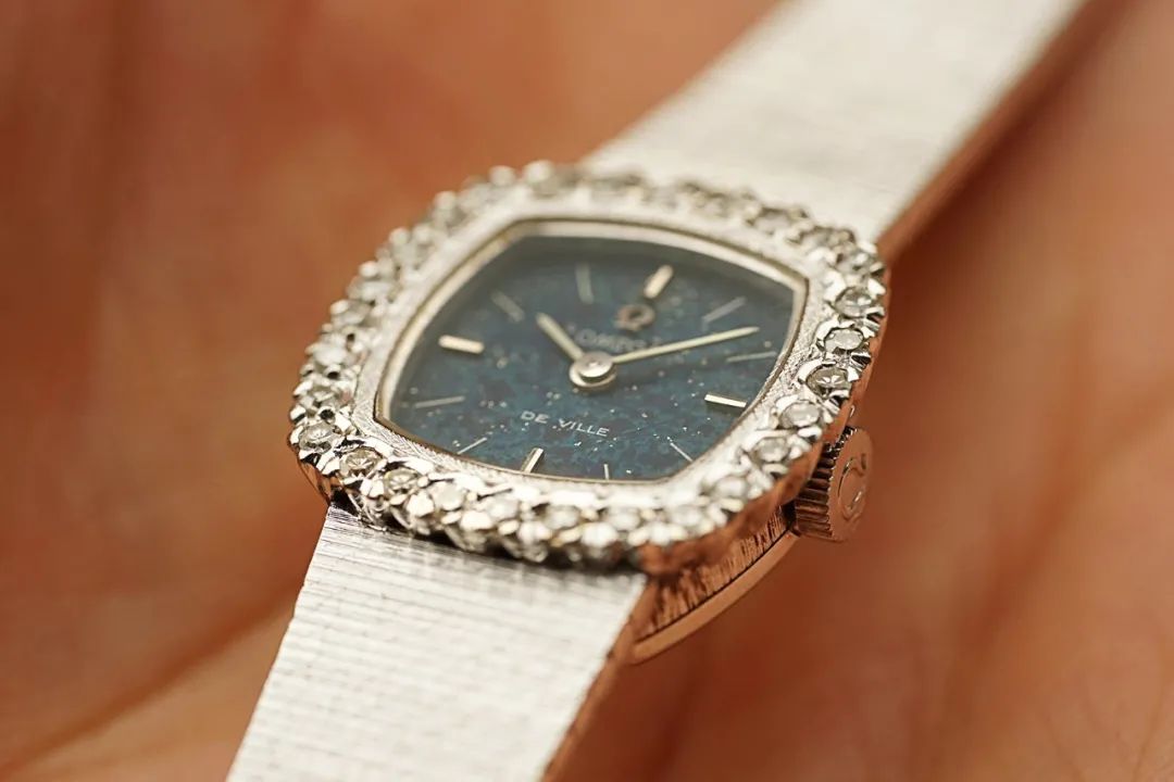 这是一枚非常精致漂亮的古董OMEGA碟飞系列女士白金腕表 / 1969年瑞士生产 / 小巧的方形表壳直径18mm周围镶嵌晶莹璀璨的钻石 / 表壳与表链融为一体长度175mm / 整体均为18K白金打造并手工潤饰 / 迷人的蓝色两针表盘 / 纤细的白色刻度字体与指针 / 内部装载精致的17钻OMEGA485手动上链机芯 / 机芯呈现暖暖的玫瑰金色泽 / 即是视觉上的享受又有效保护机芯防止被侵蚀