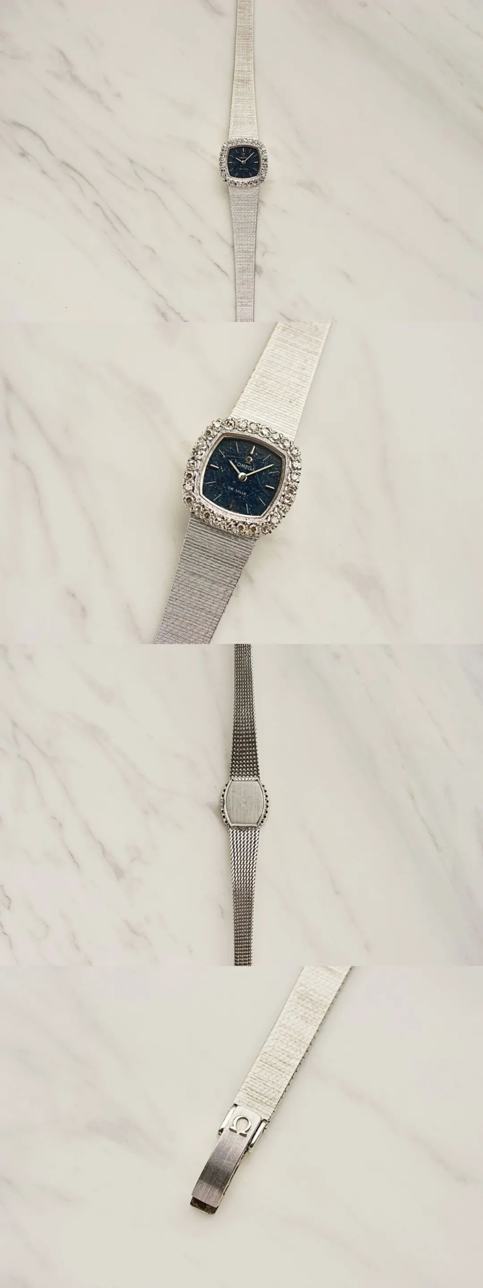 这是一枚非常精致漂亮的古董OMEGA碟飞系列女士白金腕表 / 1969年瑞士生产 / 小巧的方形表壳直径18mm周围镶嵌晶莹璀璨的钻石 / 表壳与表链融为一体长度175mm / 整体均为18K白金打造并手工潤饰 / 迷人的蓝色两针表盘 / 纤细的白色刻度字体与指针 / 内部装载精致的17钻OMEGA485手动上链机芯 / 机芯呈现暖暖的玫瑰金色泽 / 即是视觉上的享受又有效保护机芯防止被侵蚀