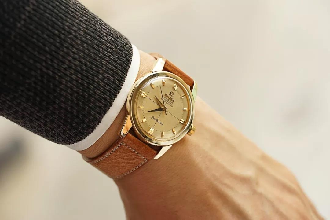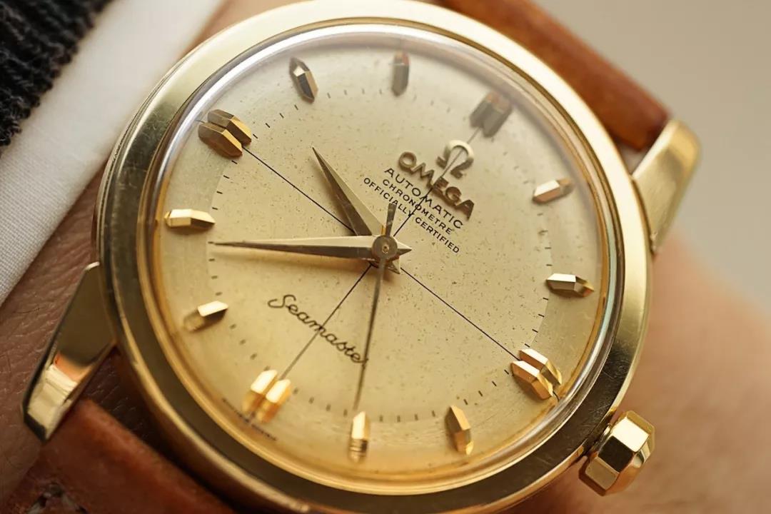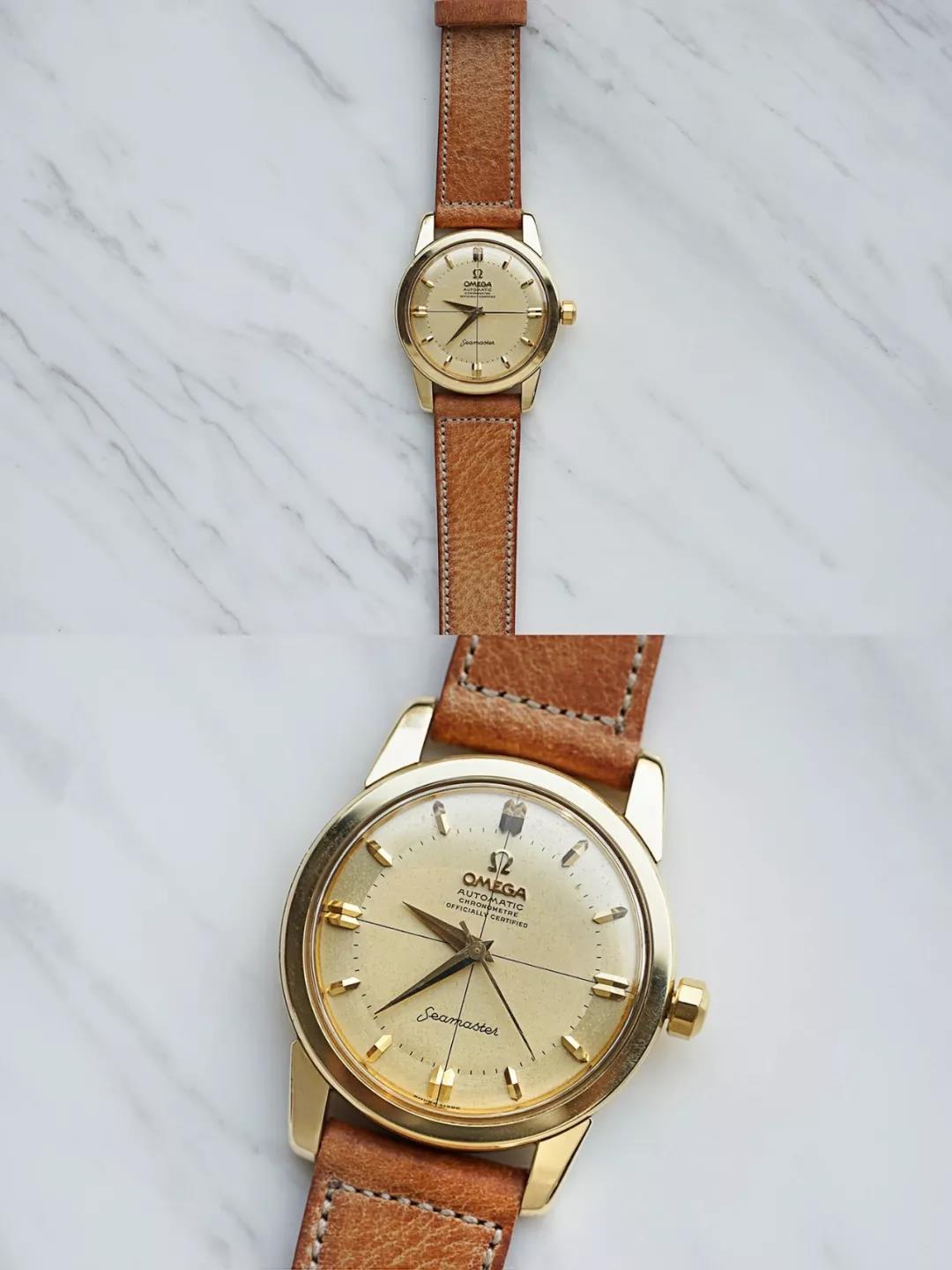 这是一枚非常非常美丽又非常非常罕有的古董OMEGA海马系列男士金表,1954年瑞士生产,厚实的圆形14K黄金表壳直径34mm,表耳粗壮有力。迷人的大三针十字线表盘因漫长岁月而微微斑驳泛黄却呈现出一种独特的美感,早期金质立体刻度造型非常特别,高高拱起折射着光。