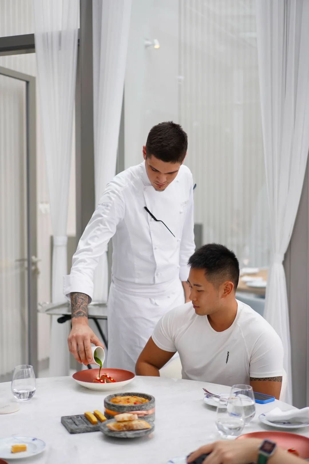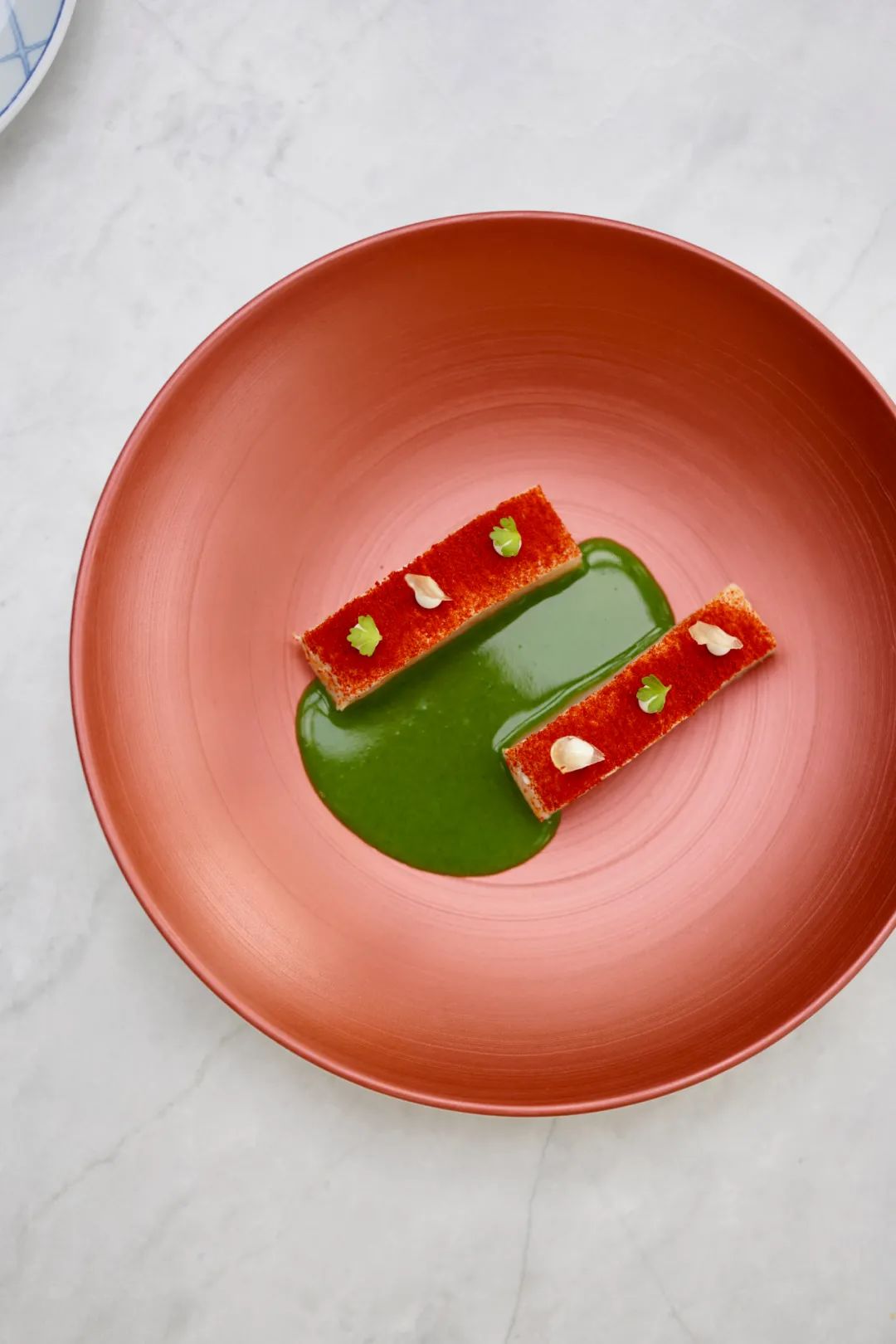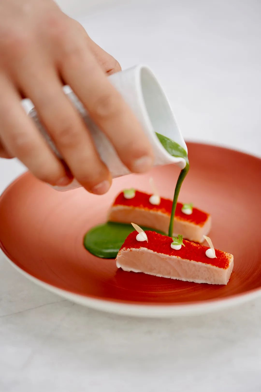 轻微炙过的鰤鱼,接近刺身的水润和脆感,上面一层红色的新疆甜辣椒粉,再浇上绿色的意式蒜味青酱。