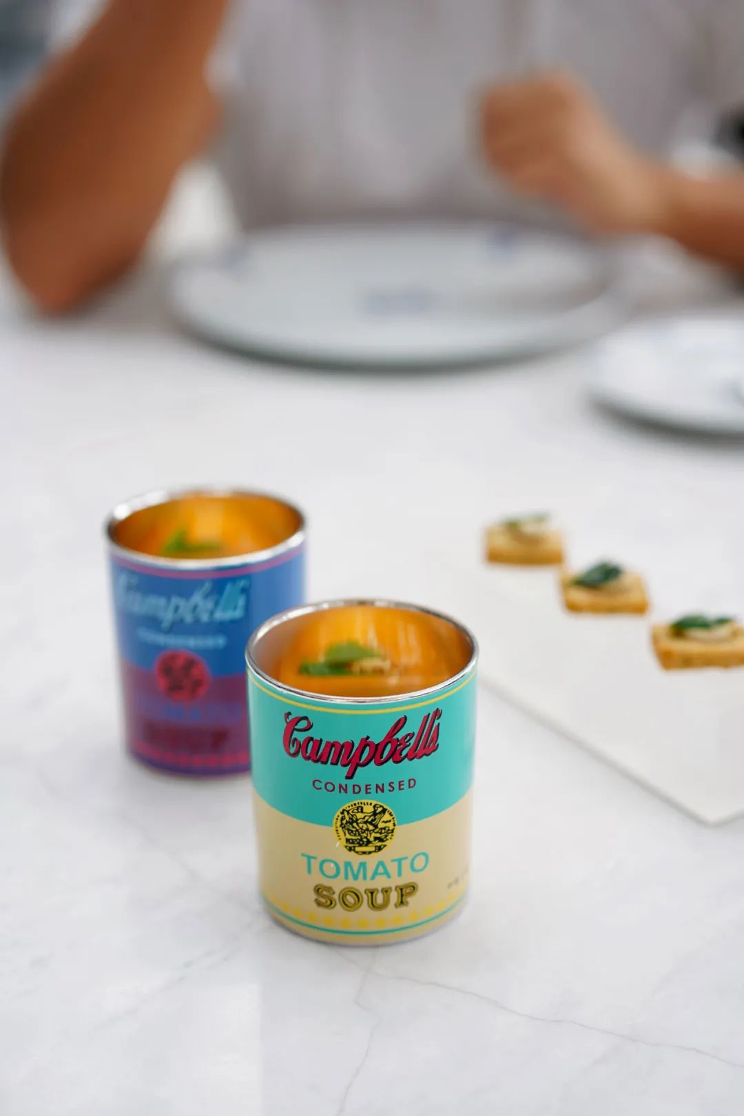 餐厅开在尤伦斯,当然要玩一点波普艺术,先给每位客人送一个 Andy Warhol 的康宝罐头。 里面是番茄冷汤,加了些面包糠碎,酸甜开胃。